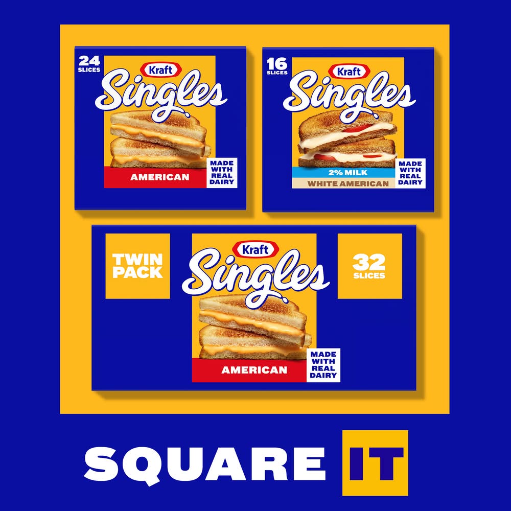 Delicious any way you square it, Kraft Singles American Cheese Slices deliver the classic American taste and irresistible melt that take your favorite foods to the next level. Made with real dairy and no artificial flavors or preservatives, our sliced cheese has a mild, savory flavor and smooth, creamy texture that’s perfectly melty. Our simple squares are ideal for more than just grilled cheese. Try adding Kraft Singles to your breakfast sandwich, burger or tuna melt. Transform steak and bread into a Philly cheesesteak, put a twist on ramen or turn plain fries into ooey gooey cheese fries. When you’re craving classic comfort food, add America's favorite square to your mac and cheese for a simple joy that’s sure to make you smile. Each cheese slice comes individually wrapped for convenience, so you can stack and snack any time. Kraft Singles contain 50 calories and 3 grams of protein per serving. For optimal creamy goodness, keep our pack of 32 cheese slices refrigerated. • Flavor: American • Kraft Heinz Foods Company, Chicago,IL,60601