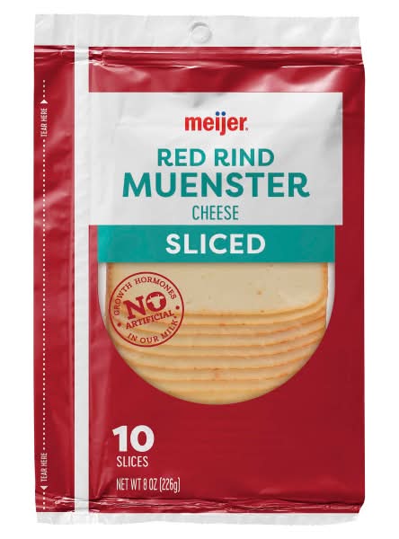 Meijer Sliced Muenster Cheese comes in sliced form and is packaged in an 8 oz size. It is suitable for a variety of culinary uses including sandwiches, tuna melts, and hamburgers. The product is described as having a buttery, creamy flavor.