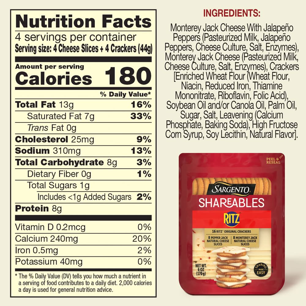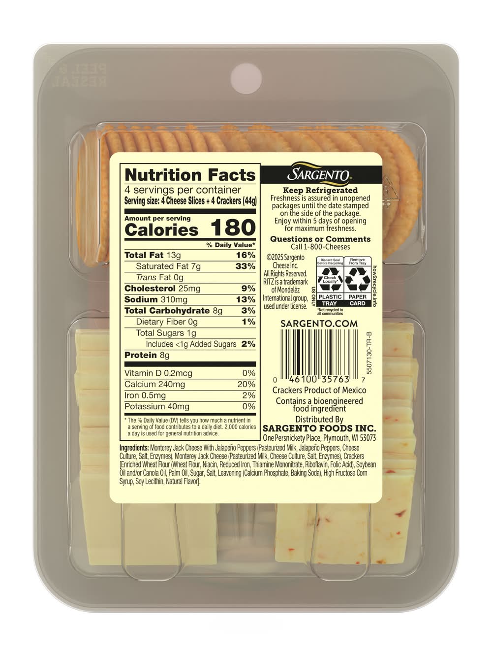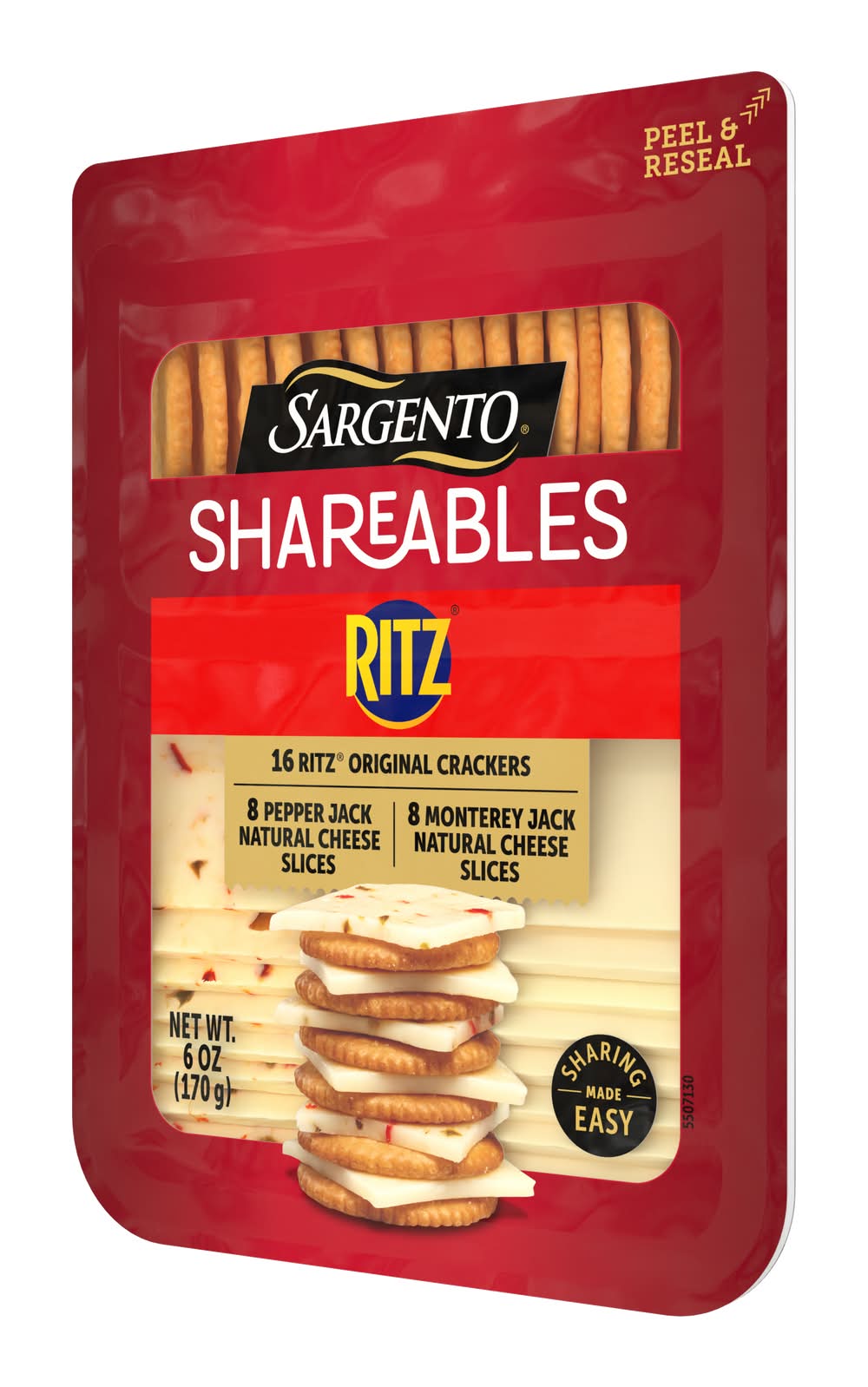 Introducing Sargento® Shareables with 16 Ritz® Original Crackers, 8 Pepper Jack Natural Cheese Slices, & 8 Monterey Jack Natural Cheese Slices, the ideal snack pack for sharing! This delicious duo combines 16 crunchy Ritz® Crackers with two varieties of Sargento® natural cheeses — 8 slices of spicy, creamy Pepper Jack and 8 slices of mild, tart Monterey Jack. The resealable tray helps ensure freshness, making it easy to enjoy anytime. Whether you're looking for a quick after-school bite or a simple appetizer for a gathering, this combo offers the perfect balance for easy sharing. For 3 generations, the Sargento family has proudly delivered high-quality, real, natural cheese you can trust. RITZ is a trademark of Mondelez International group, used under license.