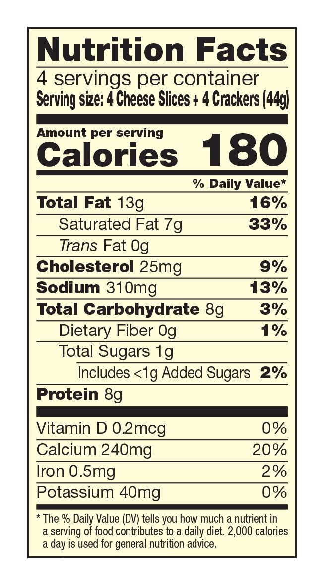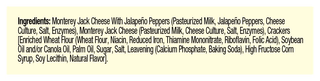 Ingredients: Monterey Jack Cheese With Jalapeno Peppers (Pasteurized Milk, Jalapeno Peppers, Cheese Culture, Salt, Enzymes), Monterey Jack Cheese (Pasteurized Milk, Cheese Culture, Salt, Enzymes), Crackers [Enriched Wheat Flour (Wheat Flour, Niacin, Reduced Iron, Thiamine Mononitrate, Riboflavin, Folic Acid), Soybean Oil and/or Canola Oil, Palm Oil, Sugar, Salt, Leavening (Calcium Phosphate, Baking Soda), High Fructose Corn Syrup, Soy Lecithin, Natural Flavor], .
