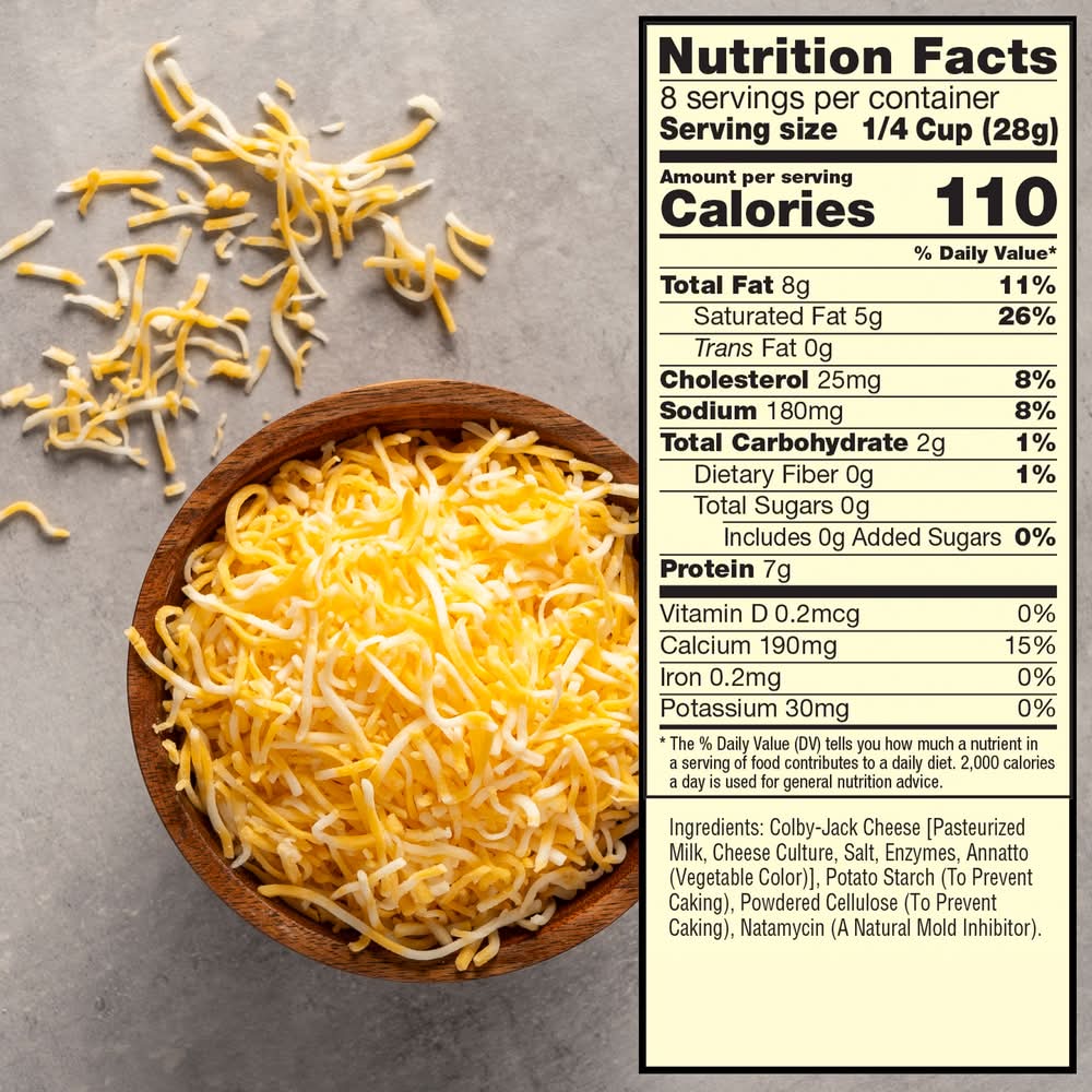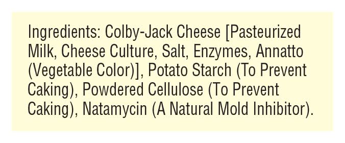 Ingredients: COLBY-JACK CHEESE [PASTEURIZED MILK, CHEESE CULTURE, SALT, ENZYMES, ANNATTO (VEGETABLE COLOR)], POTATO STARCH AND POWDERED CELLULOSE (TO PREVENT CAKING), NATAMYCIN (A NATURAL MOLD INHIBITOR), . Contains: 'Milk Contains'