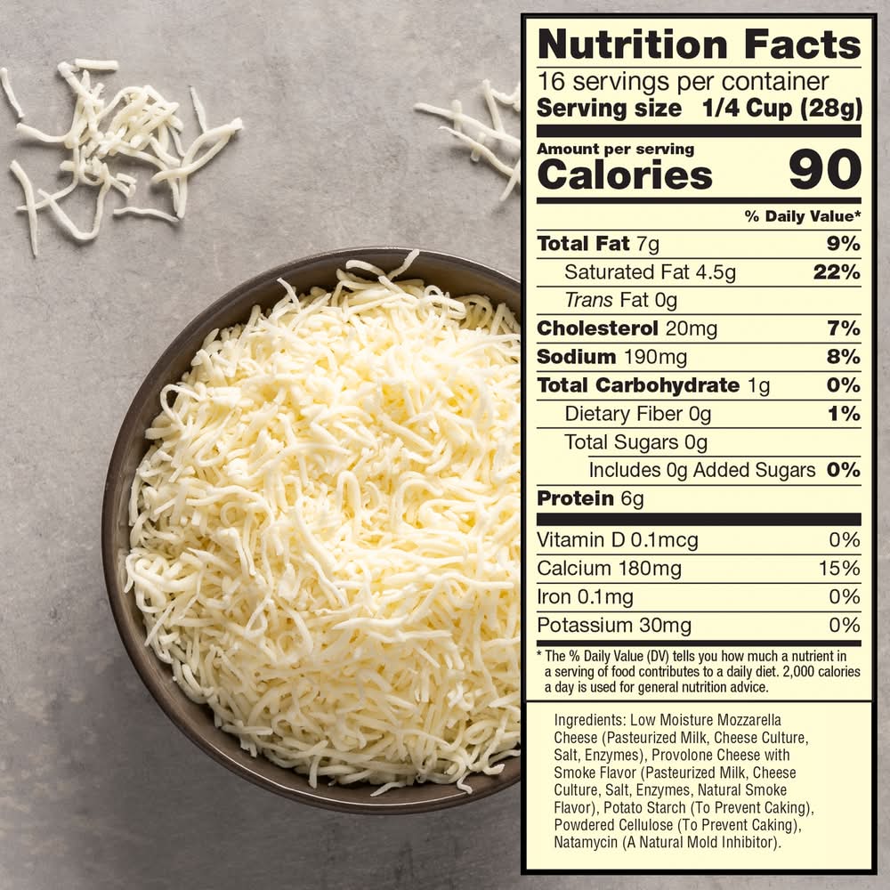 Ingredients: Low Moisture Mozzarella Cheese (Pasteurized Milk, Cheese Culture, Salt, Enzymes), Provolone Cheese with Smoke Flavor (Pasteurized Milk, Cheese Culture, Salt, Enzymes, Natural Smoke Flavor), Potato Starch (To Prevent Caking), Powdered Cellulose (To Prevent Caking), Natamycin (A Natural Mold Inhibitor), . Contains: Milk