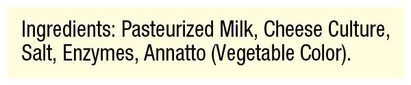 Ingredients: Pasteurized Milk, Cheese Culture, Salt, Enzymes, Annatto (Vegetable Color) Contains: 'Contains Milk'