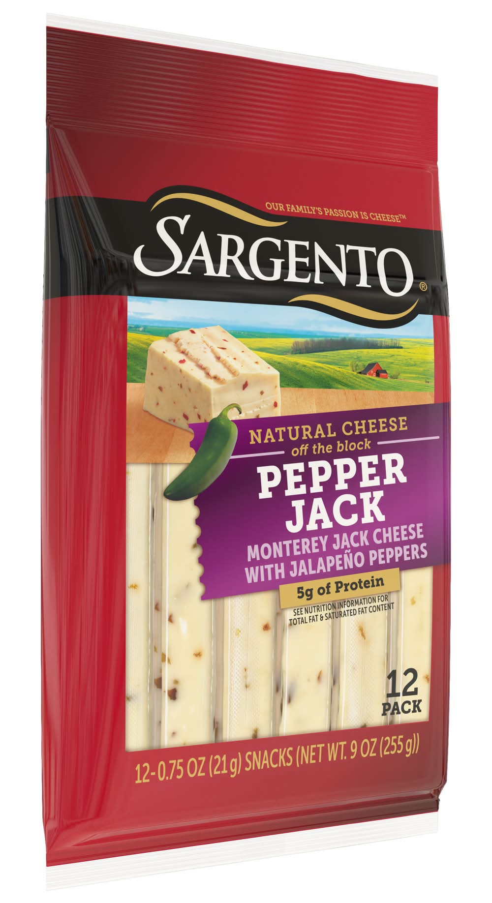 Want to spice it up a little? Add zest to your day with the heat of jalapeños and the creamy mild sweetness of Monterey Jack Cheese everywhere you go. Elevate your snacking experience with our Sargento® Pepper Jack Natural Cheese Sticks, packing 5 grams of protein* for a great on-the-go snack. Ignite your taste buds with a spicy kick wherever life takes you. Includes 12 individually wrapped cheese sticks. Packaging: Reusable
