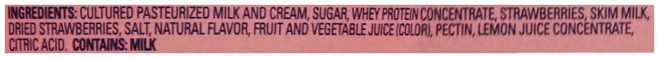 Ingredients: Cultured Pasteurized Milk and Cream, Sugar, Whey Protein Concentrate, Strawberries, Skim Milk, Dried Strawberries, Salt, Natural Flavor, Fruit and Vegetable (Color), Pectin Lemon Juice Concentrate, Citric Acid Contains: Milk