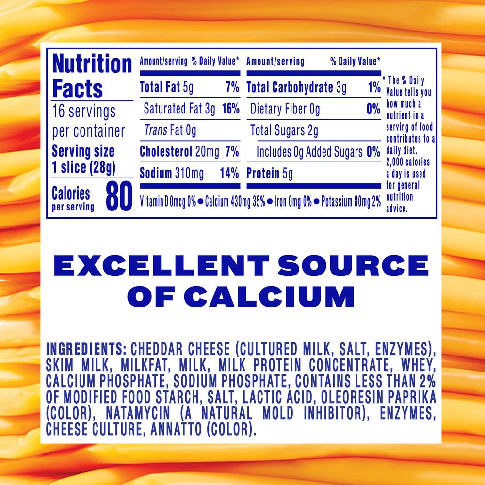 Ingredients: Cheddar Cheese (Cultured Milk Salt Enzymes), Skim Milk, Milkfat, Milk, Milk Protein Concentrate, Whey, Calcium Phosphate, Sodium Phosphate, Contains Less than 2% of Modified Food Starch, Salt, Lactic Acid, Oleoresin Paprika (Color), Natamycin (a Natural Mold Inhibitor), Enzymes, Cheese Culture, Annatto (Color) Contains: Milk