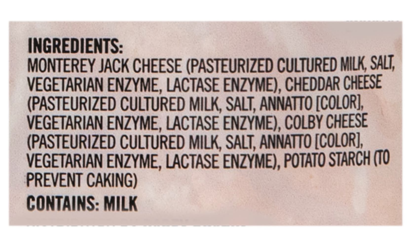 Ingredients: Monterey Jack Cheese (Pasteurized Cultured Milk, Salt, Vegetarian Enzyme, Lactase Enzyme), Cheddar Cheese (Pasteurized Cultured Milk, Salt, Annatto [Color], Vegetarian Enzyme, Lactase Enzyme), Colby Cheese (Pasteurized Cultured Milk, Salt, Annatto [Color], Vegetarian Enzyme, Lactase Enzyme), Potato Starch (to Prevent Caking) Contains: Milk