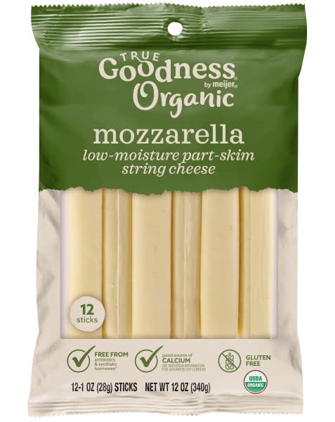 True Goodness Organic String Cheese is crafted from low-moisture part-skim cheese and serves as a versatile option suitable for snacking or cooking, such as in homemade mozzarella sticks. It is free from antibiotics and synthetic hormones, making it a choice for those seeking to avoid these additives. Additionally, it provides a source of calcium.