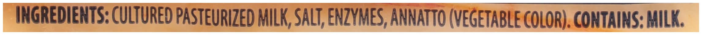 Ingredients: Cultured Pasteurized Milk, Salt, Enzymes, Annatto (Vegetable Color) Contains: Milk