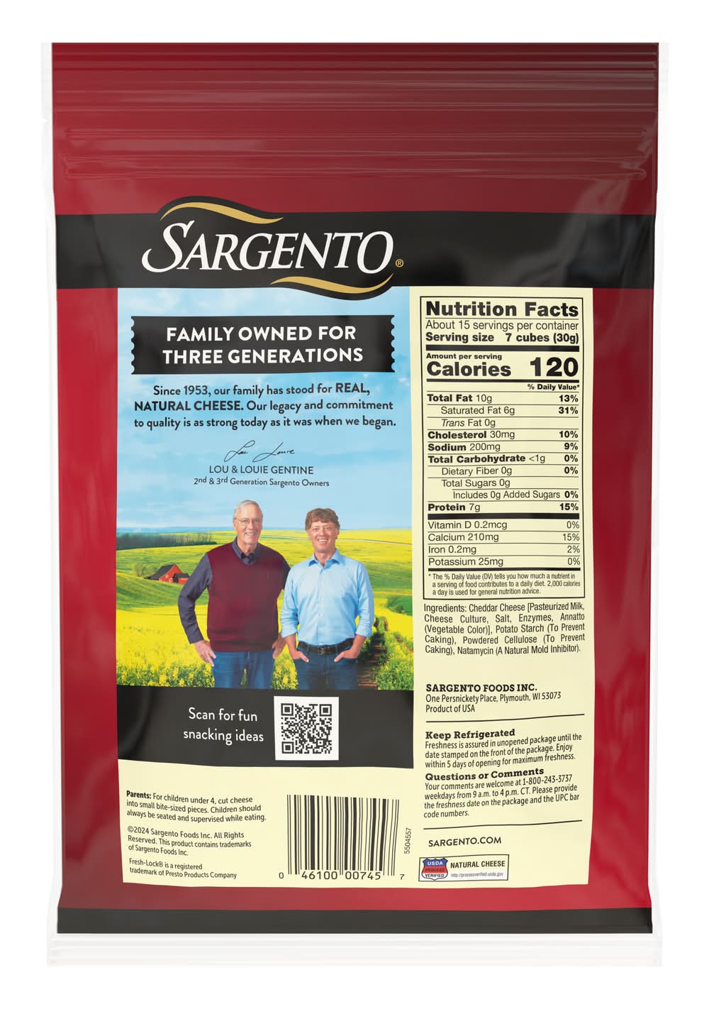 An American favorite, Cheddar cheese is incredibly versatile. Our take on Mild Cheddar cheese ups the rich, creamy taste to make a snack great all on their own or paired with crackers or other foods like apples and pears. • Number of servings: 15 • Sargento Foods Inc., Plymouth, WI, 53073, Ph: 800-243-3737