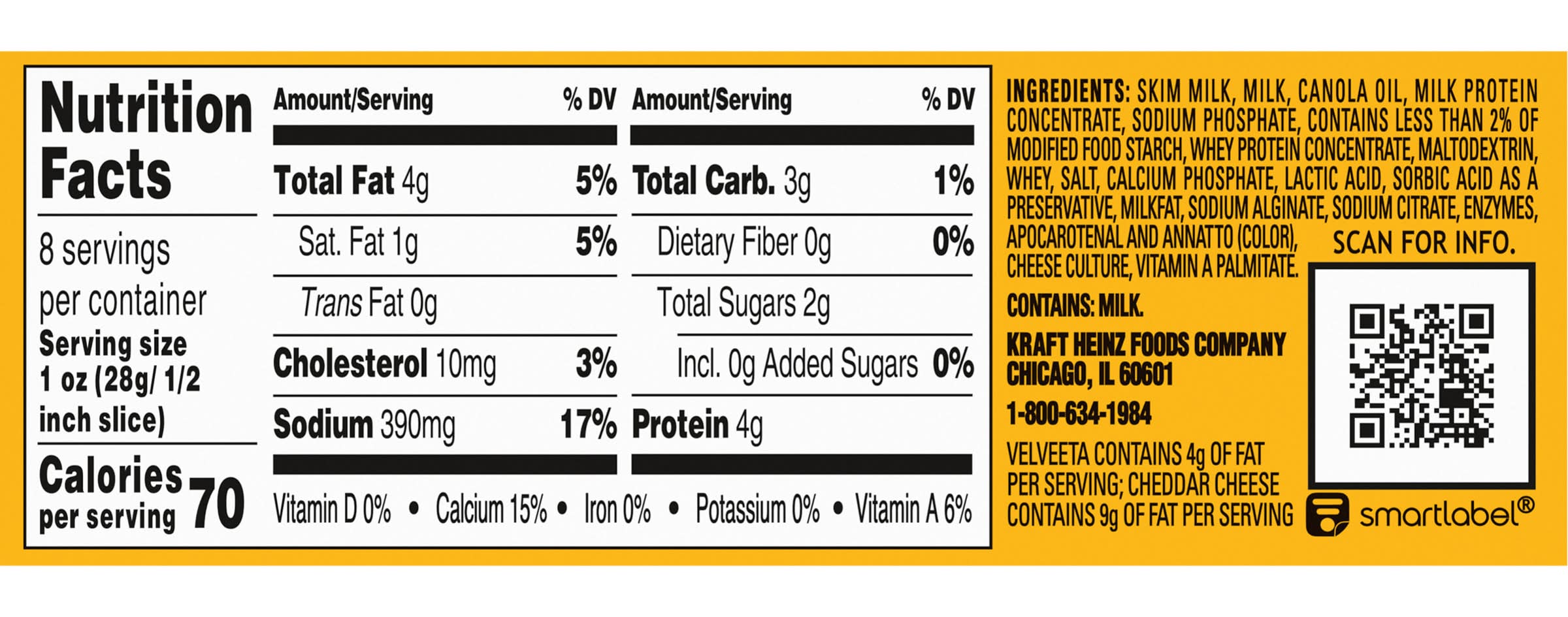 Ingredients: Skim Milk, Milk, Canola Oil, Milk Protein Concentrate, Sodium Phosphate, Contains Less than 2% of Modified Food Whey Protein Concentrate, Maltodextrin, Whey, Salt, Calcium Phosphate, Lactic Acid, Sorbic Acid as a Preservative, Milkfat, Sodium Alginate, Sodium Citrate, Enzymes, Apocarotenal and Annatto (Color), Cheese Culture, Vitamin A Palmitate Contains: Milk