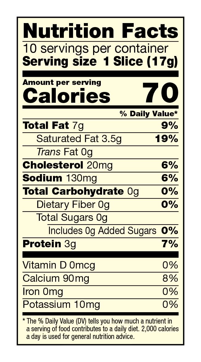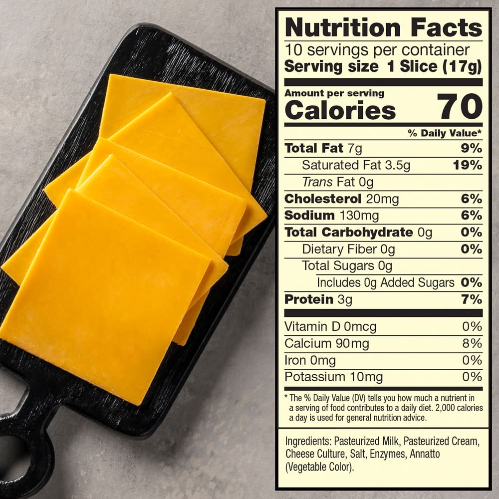Ingredients: Pasteurized Milk, Pasteurized Cream, Cheese Culture, Salt, Enzymes, Annatto (Vegetable Color), . Contains: Milk