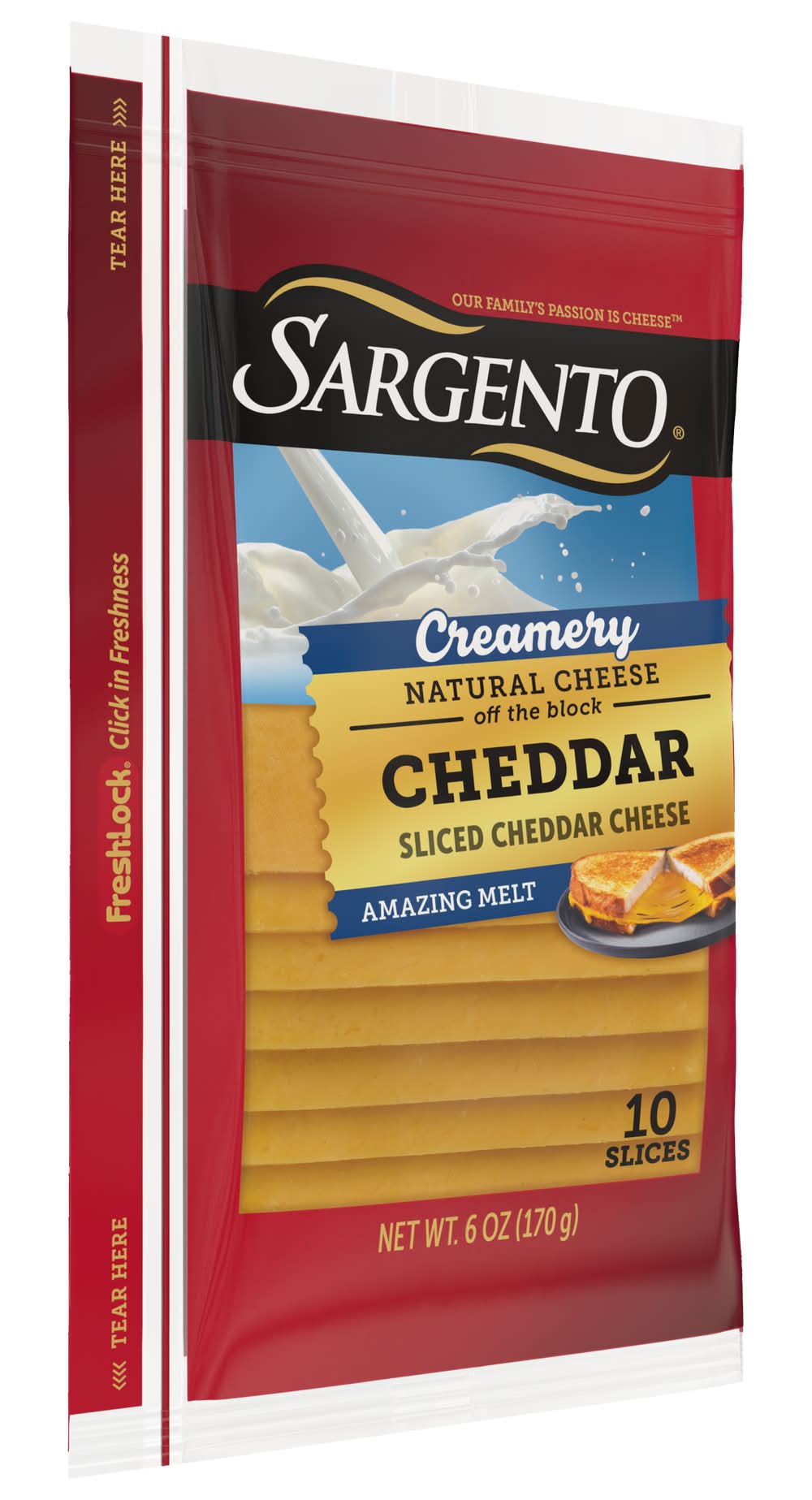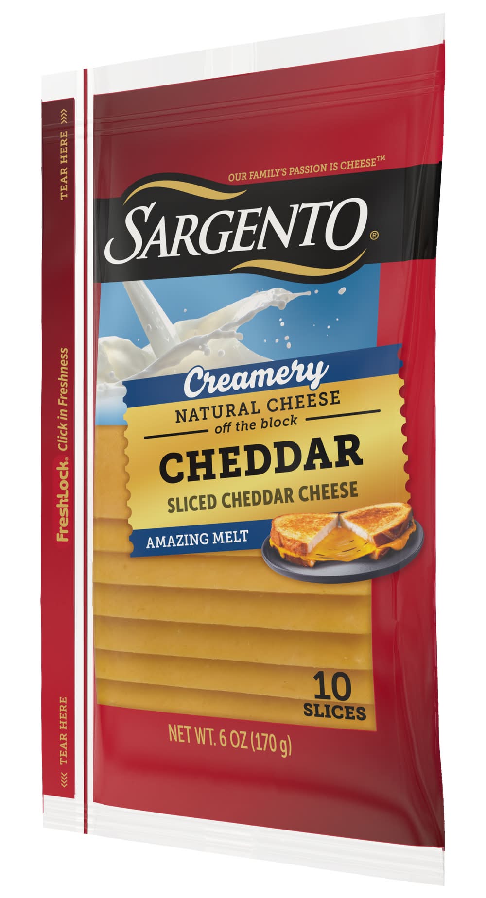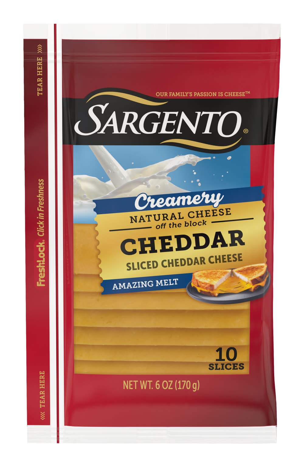 Sargento® Creamery Sliced Cheddar Cheese is sliced from 100% real, natural cheese and delivers an amazing melt thanks to the simple addition of real cream. This delicious cheese adds creamy texture and a melty indulgence to all your favorite handhelds like grilled cheese, cheeseburgers, and patty melts. The convenient 6-ounce Fresh-Lock® seal package contains 10 slices of cheese. Contains Dairy.
