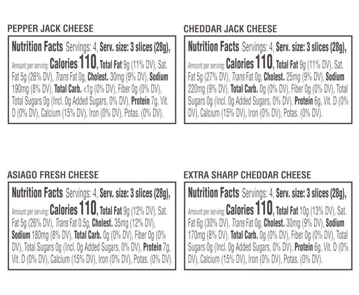 Offers a selection of four cheese varieties, each bringing its unique flavor to your cheese platter. The pack includes pepper jack cheese with a hint of jalapeno peppers for a mild kick, creamy high moisture Monterey Jack cheese, distinctively nutty asiago fresh cheese, and the robust taste of extra sharp cheddar cheese. Each variety is pre-sliced in cracker cuts, making them an ideal match for crackers, breads, and a range of appetizers. These flavorful cheese slices contain 110 calories per 3 slices and have 0 g of lactose per serving, catering to those who enjoy rich, creamy cheese without the lactose. The variety pack is designed to simplify hosting, adding a touch of convenience and taste to any social gathering. • Number of servings: 4 • Kraft Heinz Foods Company, Chicago, IL, 60601 • Packaging: Reusable