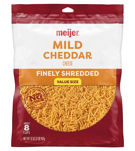 Meijer Shredded Mild Cheddar Cheese offers a mild and tangy flavor profile, suitable for enhancing various dishes or for direct consumption from the bag.