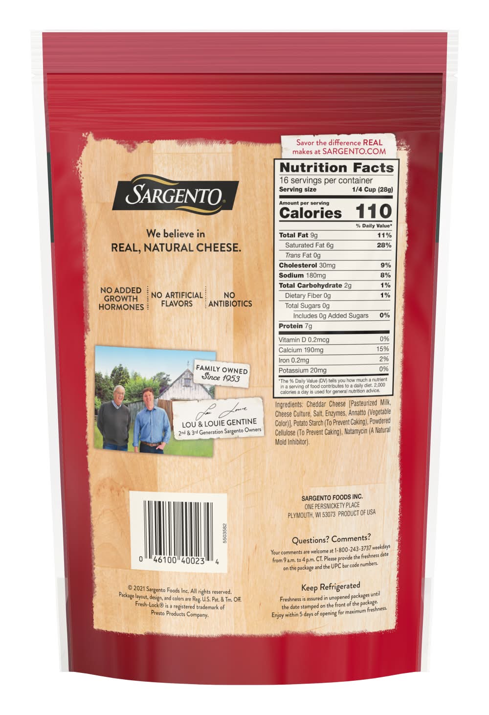 Ingredients: Cheddar Cheese [Pasteurized Milk, Cheese Culture, Salt, Enzymes, Annatto (Vegetable Color)], Potato Starch (ToPrevent Caking), Powdered Cellulose (To Prevent Caking), Natamycin (A Natural Mold Inhibitor).