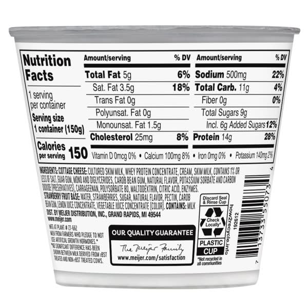 Meijer Strawberry Cottage Cheese is a grade A, small-curd cottage cheese with strawberries on the bottom. It is characterized by a rich and sweet taste and can be enjoyed as a quick snack or incorporated into breakfast menus.