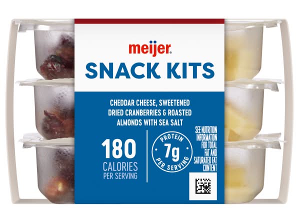 At 7 grams of protein per serving and only 180 calories, Meijer Snack KitsWhite Cheddar Cheese, Roasted Almonds with Sea Salt, and Sweetened Dried Cranberries are a great way to add some flavor to your day