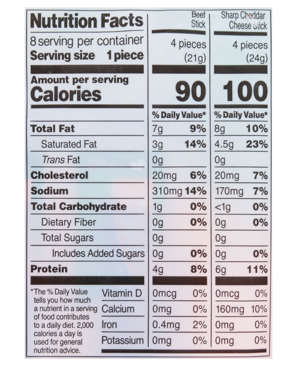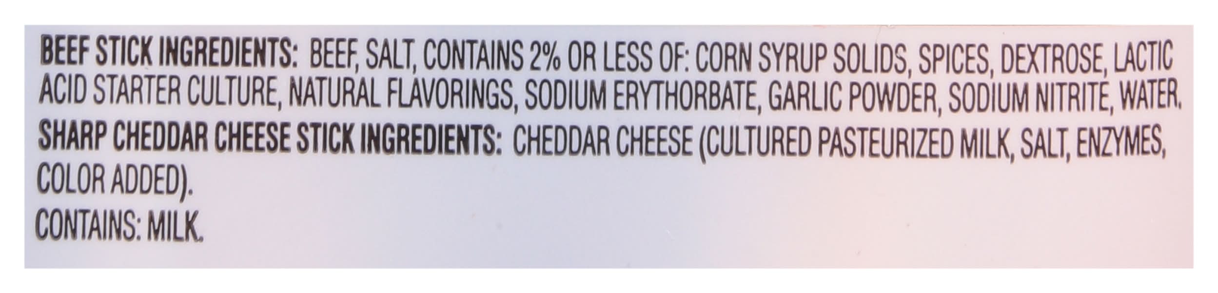 Ingredients: Beef Stick: Beef, Salt, Contains 2% or Less of: Corn Syrup Solids, Spices, Dextrose, Lactic Acid Starter Culture, Natural Flavorings, Sodium Erythorbate, Garlic Powder, Sodium Nitrite, Water. Sharp Cheddar Cheese Stick: Cheddar Cheese (Cultured Pasteurized Milk, Salt, Enzymes, Color Added). Contains: Milk
