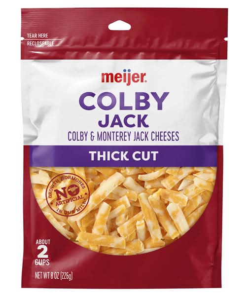 Meijer Wide Cut Monterey Pepper Jack Cheese is crafted with jalapeno peppers, offering a slightly spicy flavor. It is suitable for a variety of culinary dishes and can also be enjoyed directly from the bag.