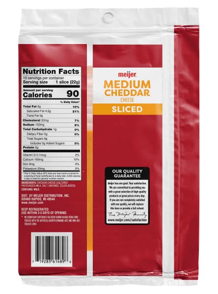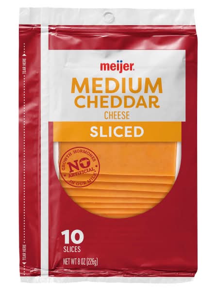Meijer Sliced Medium Cheddar Cheese is sliced for convenience and suited for use in sandwiches and on crackers. It offers a rich, creamy flavor and is noted for its aromatic quality. This cheese belongs to the medium cheddar variety.