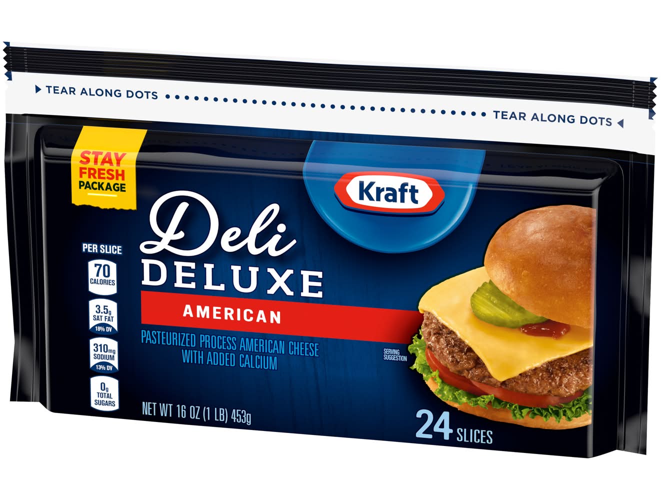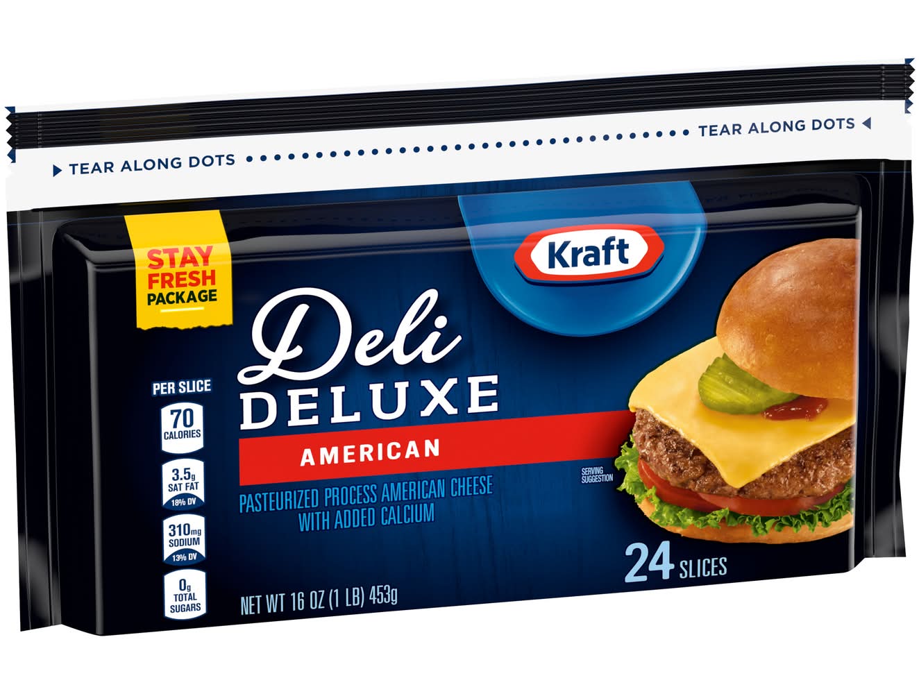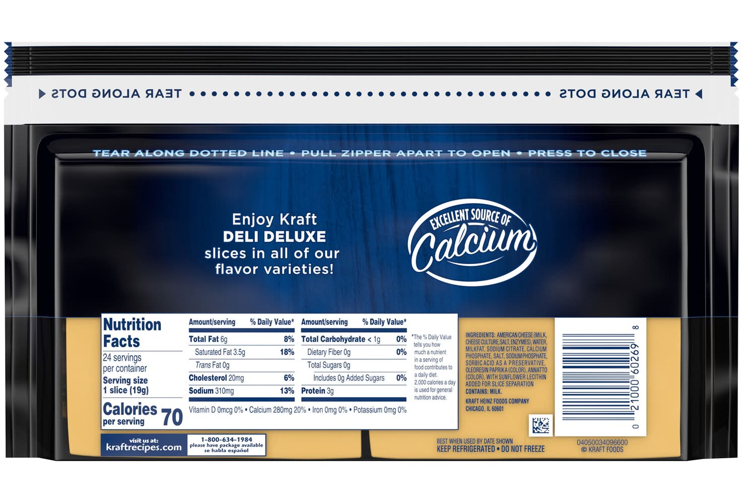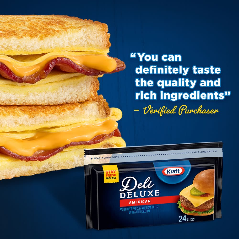 Kraft Deli Deluxe American Cheese Slices are creamy, rich and full of flavor. Enjoy our sliced American cheese with a mild, slightly tangy flavor and smooth texture that goes well with any meat or vegetable dish. Pre-sliced for your convenience, this deli style American cheese is perfect for slipping into sandwiches or snacking on straight from the package. Made with quality ingredients like pasteurized milk for full flavor and consistency. Our cheese slices contain 20% daily value of calcium per serving, see nutrition information for fat, saturated fat and sodium content. Put one of our creamy American cheese slices on any sandwich or burger for the perfect melt, or add them to a cheese sauce to elevate your classic mac and cheese recipe. Kraft Heinz Foods Company, Chicago, IL, 60601