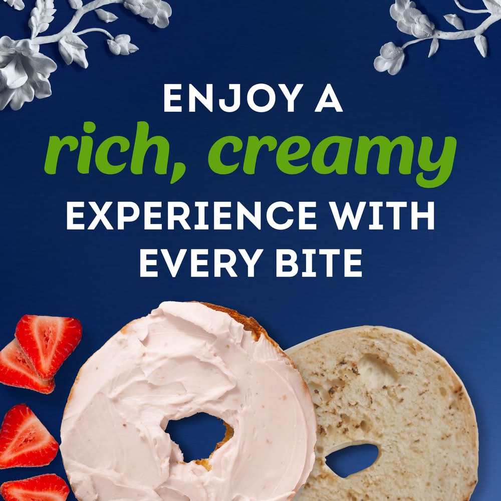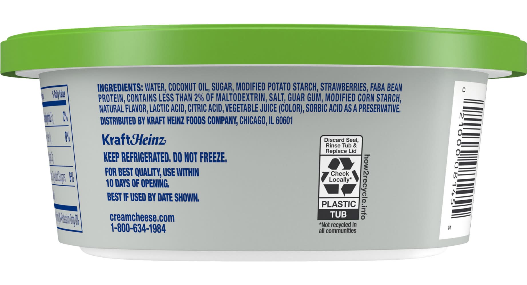 Dive into immersive pleasure. Philadelphia Plant-Based Strawberry Non-Dairy Spread is dairy-free, lactose-free and gluten-free while keeping an extra creamy, multi-dimensional taste you can add to any meal. We leave out artificial dyes at Philly. Our plant-based spread is easy to use, making it the perfect choice for adding to your morning bagel, toast, fresh fruit or pancakes. Keep our 8 oz resealable container of spread refrigerated. With Philadelphia, enjoy a rich, creamy experience with every bite. You don't just taste it. You feel it. Packaging: Reusable