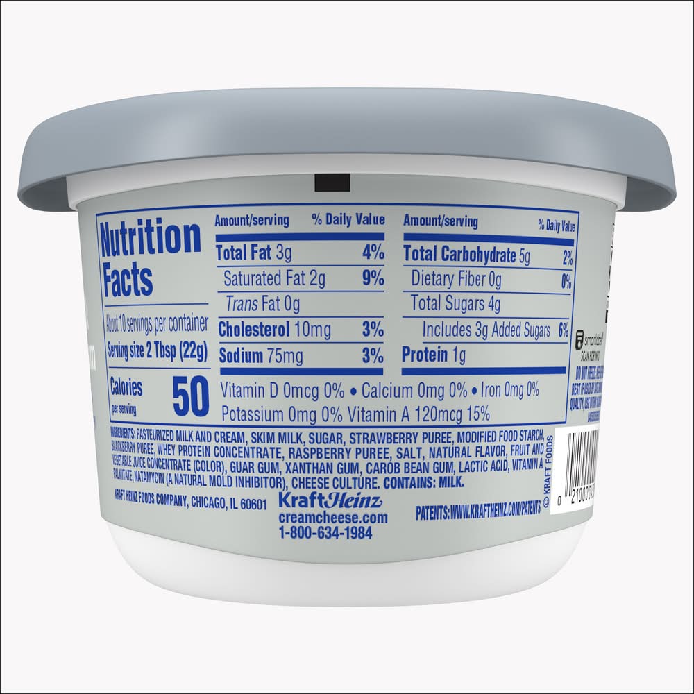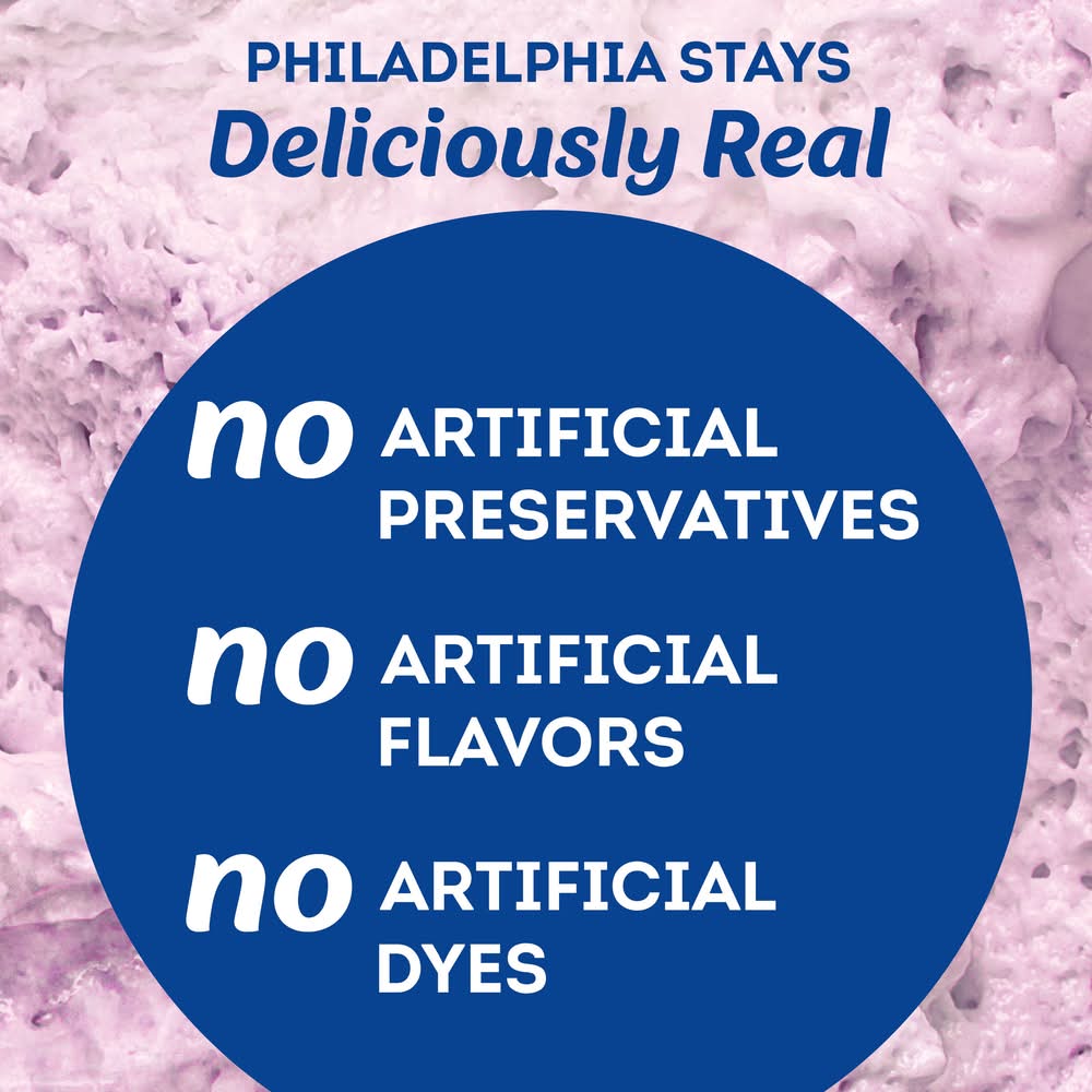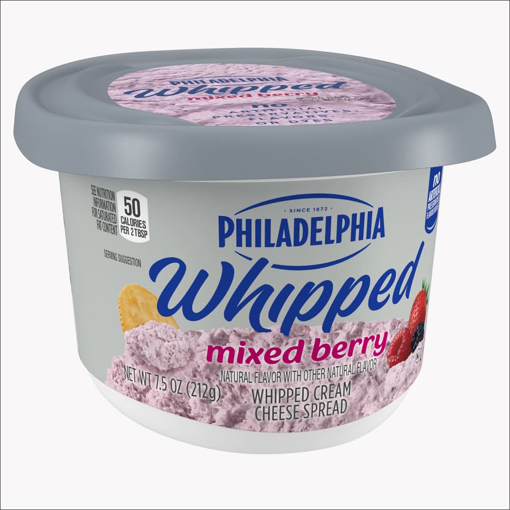 Dive into immersive pleasure with Philadelphia Mixed Berry Whipped Cream Cheese Spread. Fresh milk, real cream and berries are whipped for an extra creamy, multi-dimensional taste you can add to any meal. At Philly, we leave out the artificial preservatives, flavors and dyes to ensure a rich, quality flavor. Our light and fluffy whipped berry cream cheese spread is easy to spread, making it the perfect choice for adding to your morning bagel or dipping your favorite fruits. Keep our 7.5 ounce reclosable container of cream cheese spread refrigerated. With Philadelphia Cream Cheese Spread, enjoy a rich, creamy experience you don't just taste, you feel. • Flavor: Mixed berry • Kraft heinz foods company, Chicago,IL,60601,USA