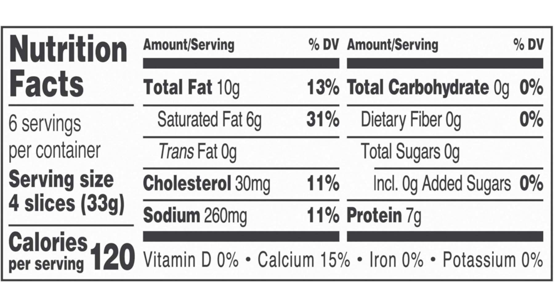 Ingredients: PASTEURIZED MILK, CHEESE CULTURE, SALT, ENZYMES, ANNATTO (COLOR). Contains: CONTAINS: MILK.