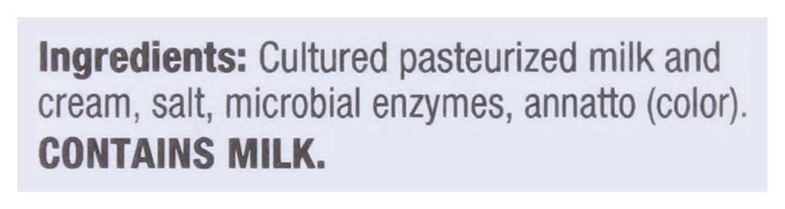 Ingredients: Cultured Pasteurized Milk and Cream, Salt, Microbial Enzymes, Annatto (Color) Contains: Milk