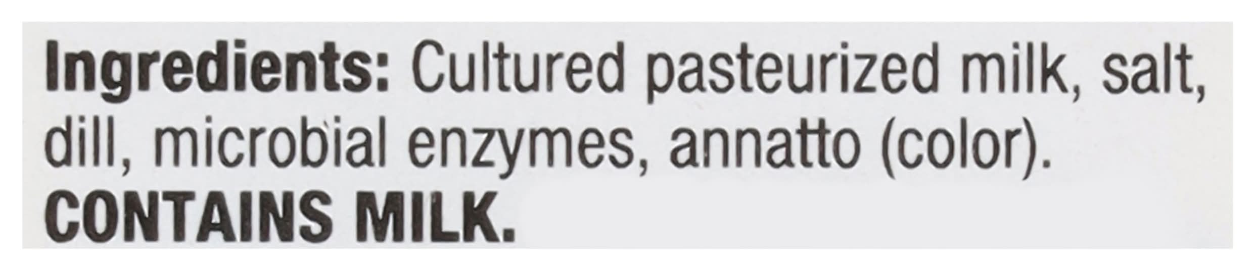Ingredients: Cultured Pasteurized Milk, Salt, Dill, Microbial Enzymes, Annatto (Color) Contains: Milk