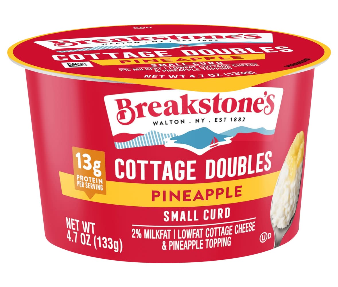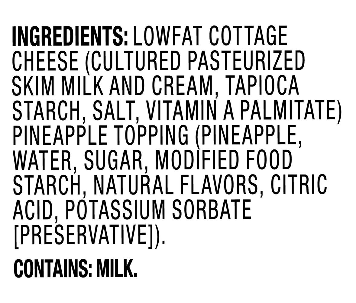 Ingredients: Lowfat Cottage Cheese (Cultured Pasteurized Grade A Skim Milk and Cream, Tapioca Starch, Salt, Vitamin A Palmitate), Pineapple Topping (Pineapple, Water, Sugar, Modified Food Starch, Natural Flavor, Citric Acid, Potassium Sorbate [Preservative]). Contains: Milk