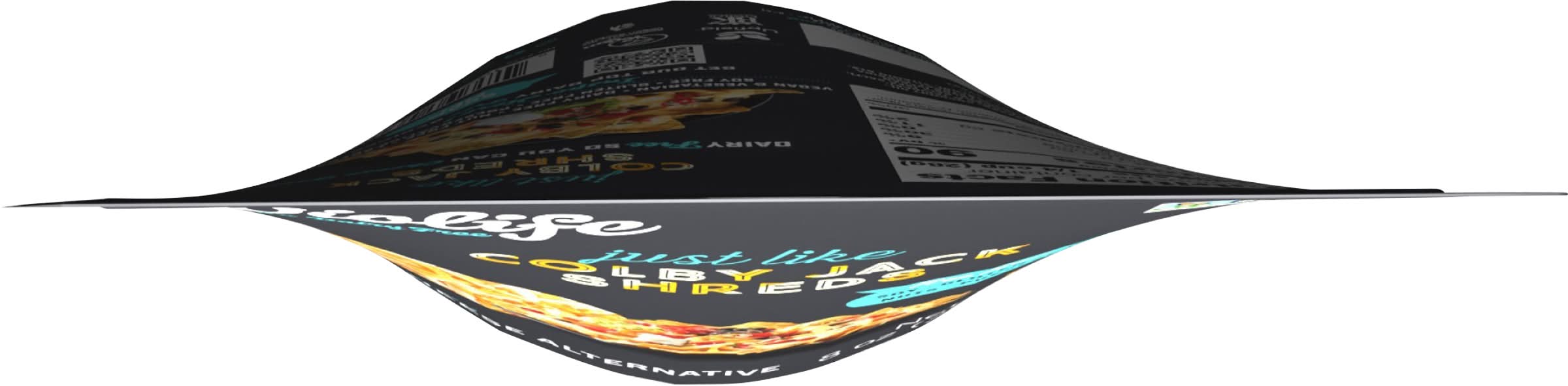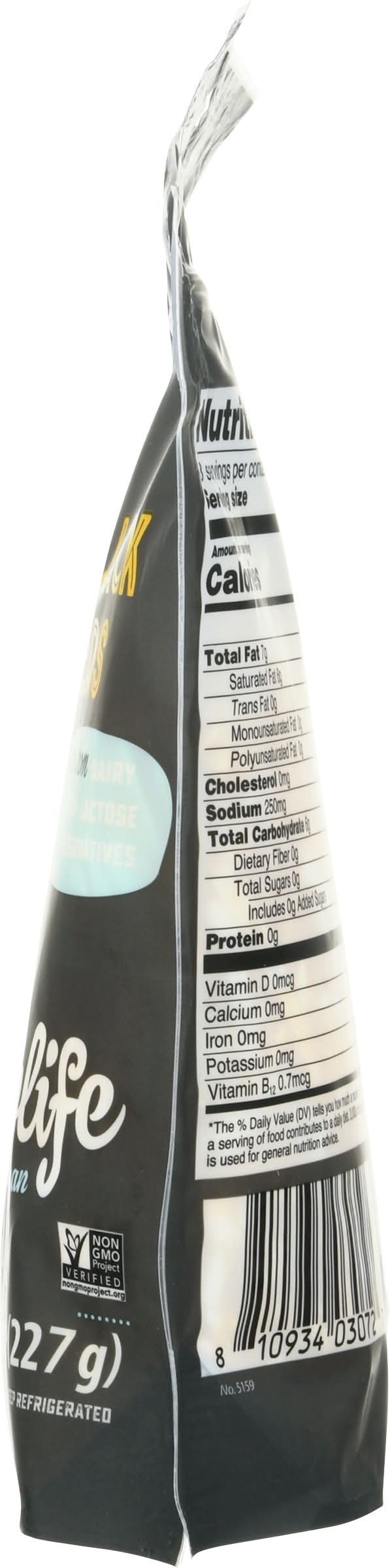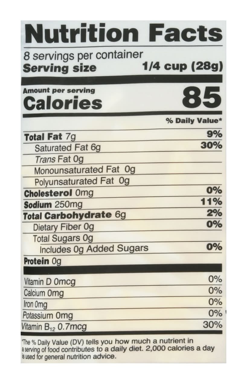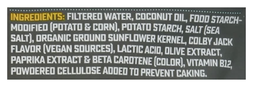 Ingredients: Filtered Water, Coconut Oil, Food Starch Modified (Potato & Corn), Potato Starch, Salt (Sea Salt), Organic Ground Sunflower Kernel, Colby Jack Flavor (Vegan Sources), Lactic Acid, Olive Extract, Paprika Extract & Beta Carotene (Color), Vitamin B12, Powered Cellulose Added to Prevent Caking Contains: Tree Nuts, Coconuts, Corn