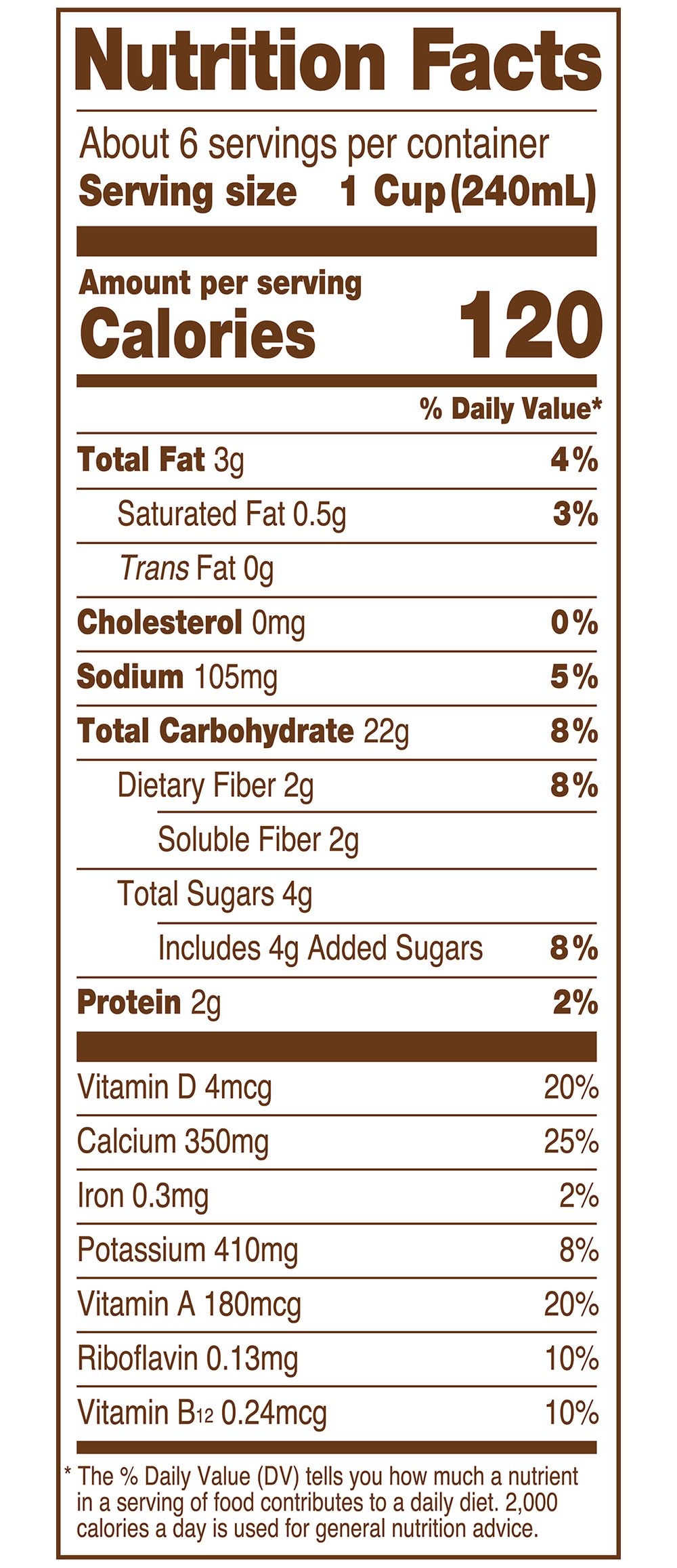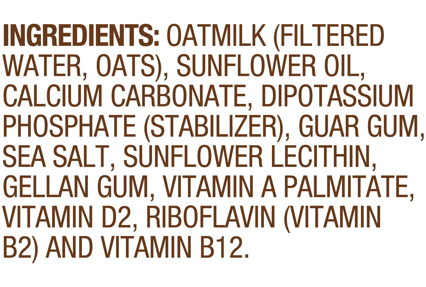 Ingredients: OATMILK (FILTERED WATER, OATS), SUNFLOWER OIL, CALCIUM CARBONATE, DIPOTASSIUM PHOSPHATE (STABILIZER), GUAR GUM, SEA SALT, SUNFLOWER LECITHIN, GELLAN GUM, VITAMIN A PALMITATE, VITAMIN D2, RIBOFLAVIN (VITAMIN B2) AND VITAMIN B12. Contains: NO ALLERGENS