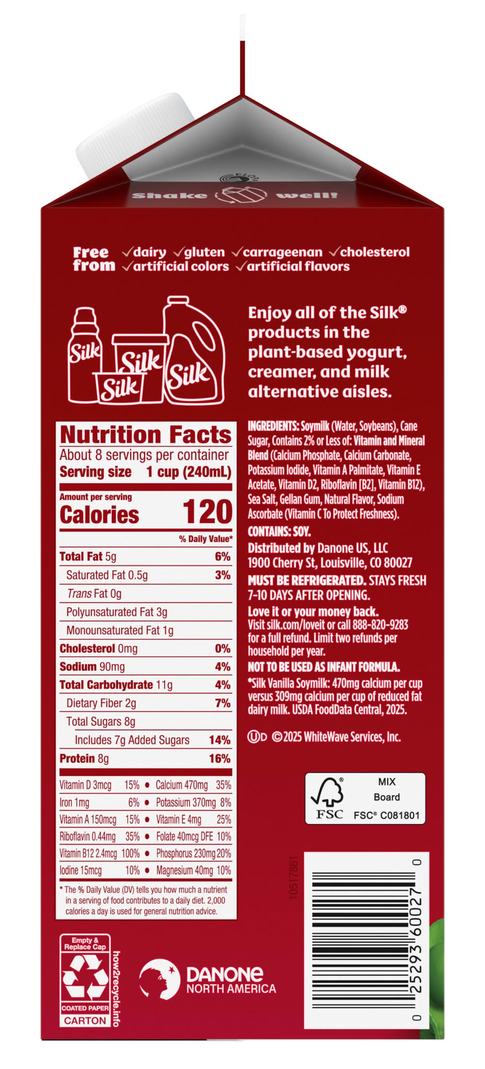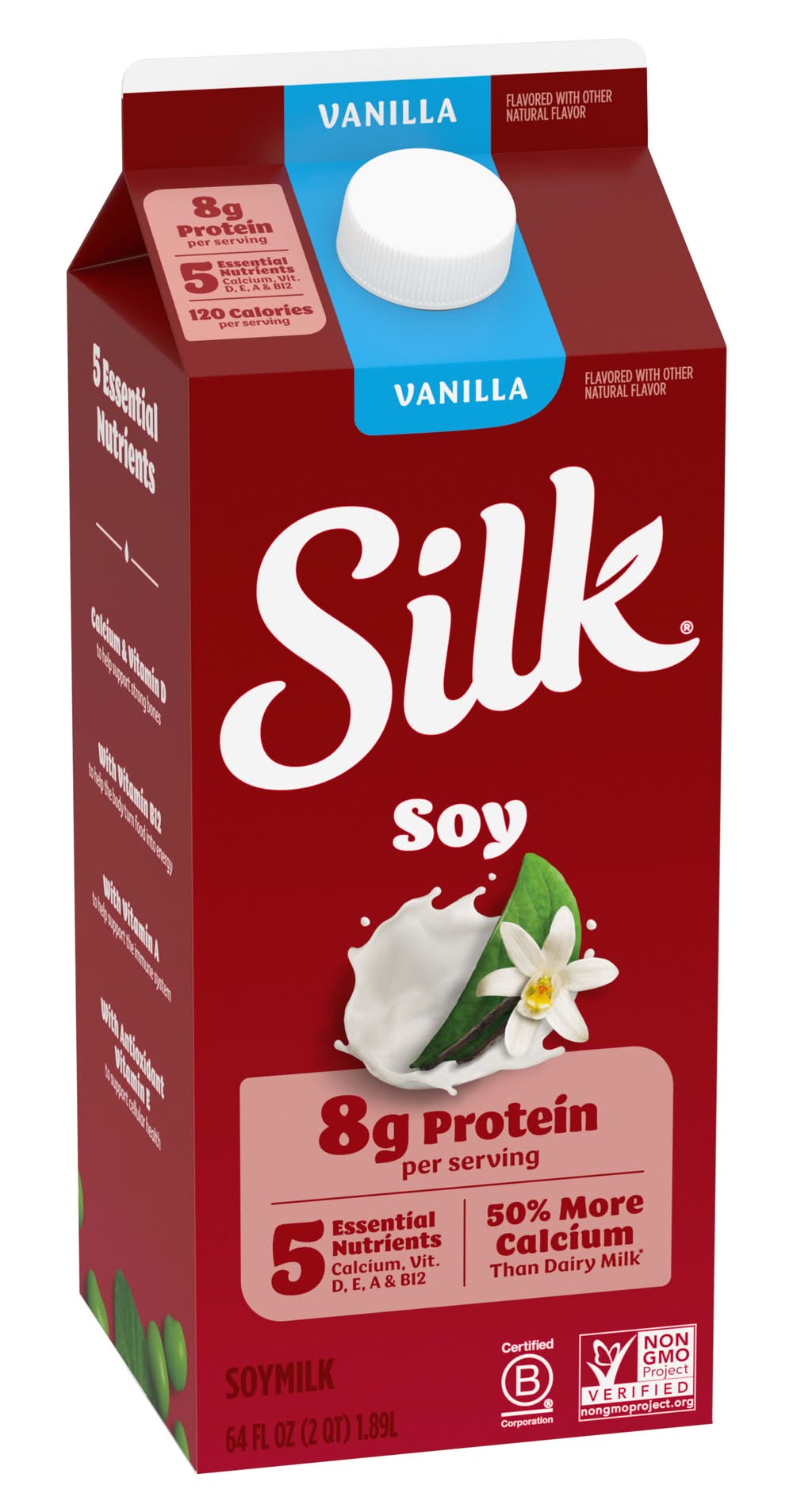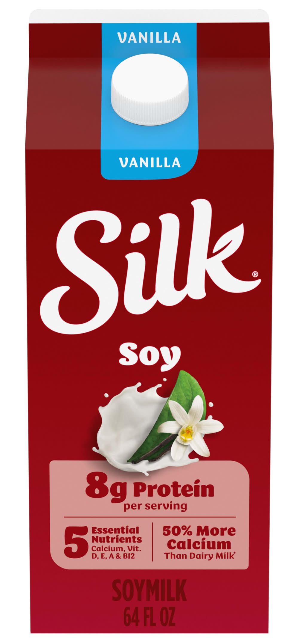 Treat yourself with Silk Vanilla Soymilk, Made with whole harvested soybeans grown by Mother Nature, this lactose free milk is the Original Nutrition Powerhouse. It's an extraordinary tasting plant based milk that you can use throughout your day. Every serving of this nondairy milk has 50% more calcium than dairy milk, along with 6 grams of complete plant-based protein (12% DV). Silk Soymilk is totally free of dairy, gluten, carrageenan, cholesterol, artificial colors and artificial flavors. Looking for lactose free cooking or baking supplies? Whether you’re making a healthy smoothie, making a bowl of tasty cereal or drinking straight out of a glass, trust Silk — the Original Plant Pioneer. Read more about our story on our packaging. Enjoy all of the Silk products, including vegan milk, non dairy creamer and dairy free yogurt varieties. Silk Vanilla Soymilk: 470mg calcium per cup; reduced fat dairy milk: 309mg calcium per cup. USDA, ARS. Food Data Central, 2022. Flavored with other natural flavors. • Flavor: Vanilla • Whitewave foods, Broomfield, CO 80021 • Packaging: Reusable