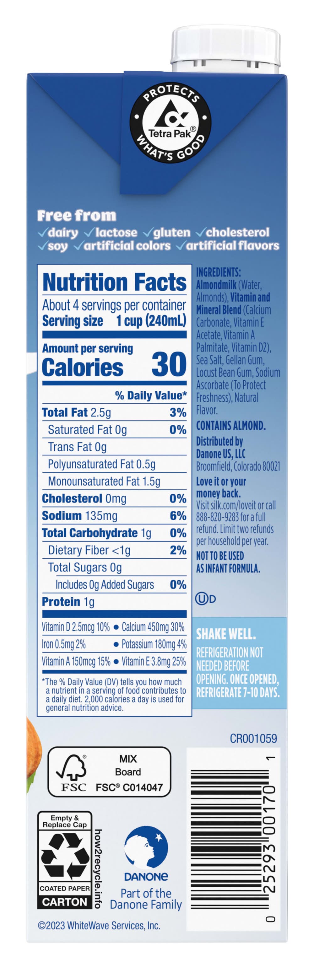 Treat yourself to shelf-stable Silk Unsweetened Almondmilk. Made with three types of almonds that are grown by mother nature, this dairy free, gluten free, and lactose free milk is simply delicious. Plus, it's an extraordinary tasting plant based milk that you can use throughout your day. Every serving of this non dairy milk is a good source of calcium and vitamin D to help support strong bones. Silk Almondmilk is free of dairy, lactose, soy, gluten, cholesterol, artificial colors and artificial flavors. This shelf-stable almondmilk doesn’t require refrigeration until after opening, so you can stock up and store this dairy free milk for months without sacrificing taste. Whether you’re making a healthy smoothie, making a bowl of tasty cereal, looking for baking supplies or drinking straight out of a glass, trust Silk — the Original Plant Pioneer. Enjoy more Silk products, including vegan milk, non dairy creamer and dairy free yogurt varieties. • Danone US, Broomfield,Colorado,80021 • Packaging: Reusable