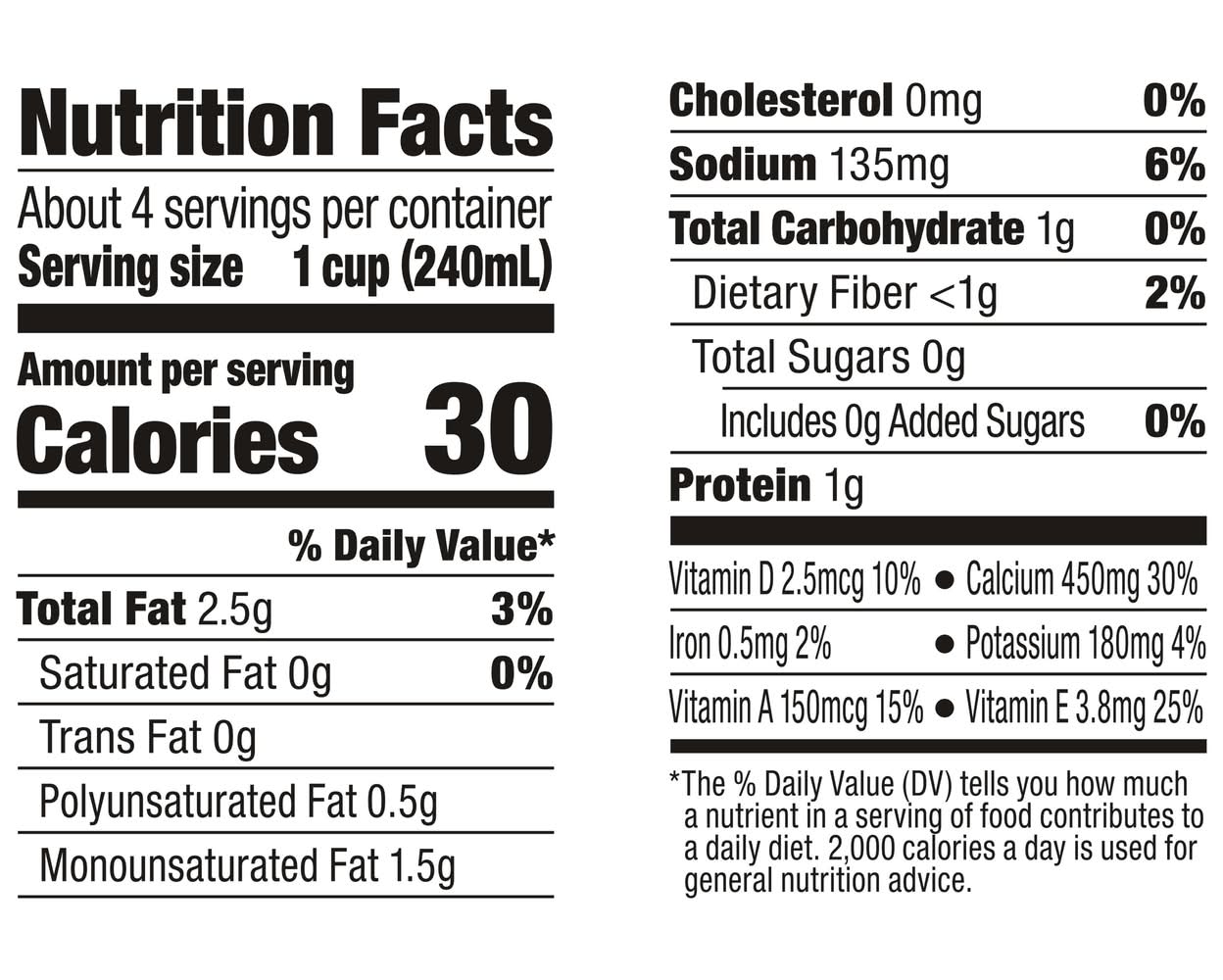 Ingredients: INGREDIENTS: Almondmilk (Filtered Water; Almonds), Vitamin and Mineral Blend (Calcium Carbonate; Vitamin E Acetate; Vitamin A Palmitate; Vitamin D2), Sea Salt, Gellan Gum, Locust Bean Gum, Sodium Ascorbate (to protect freshness), Natural Flavor Contains: Contains almond. Produced in a facility that also processes other tree nuts and soy.