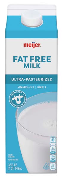 Meijer Fat Free Milk is a 1-quart container of fat-free milk known for its smooth, creamy flavor. It is versatile and can be used in a variety of recipes, from smoothies to yogurt, accommodating different culinary needs.
