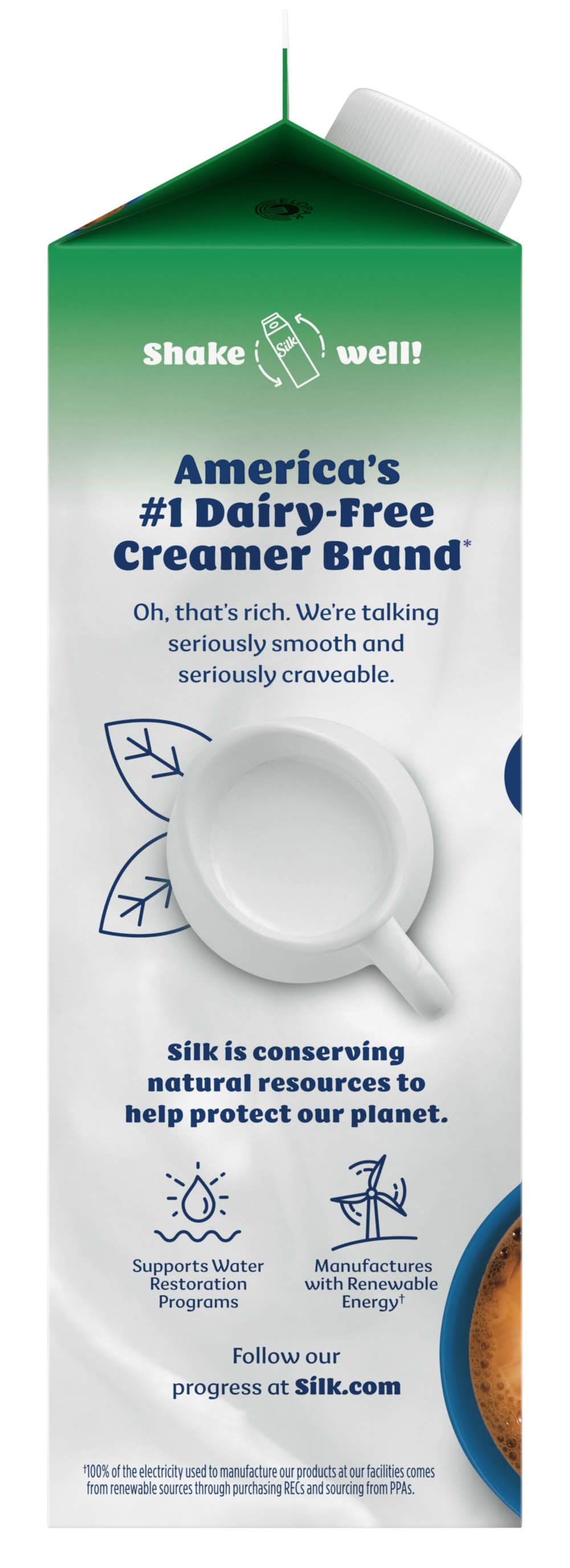 Make your days more flavorful with Silk Half & Half Alternative. Not your average coffee creamer, this smooth and lusciously creamy dairy free oat and coconut half and half creamer alternative is a great way to start your day. Plus, it's free of lactose, carrageenan, gluten and cholesterol and there are no artificial colors or flavors in this lactose free half and half alternative. Silk Half and Half alternative is a great choice for any lifestyle. Make a “me” moment by adding a splash of this vegan creamer alternative to smoothies, shakes, your morning coffee or anything that could use a smooth and creamy oat- and coconut-flavored boost. At Silk, we believe in the power of plants to do a world of good, so people can enjoy good, feel good and do good. Silk gluten free, non dairy creamer is the #1 brand of plant based creamers.* It’s also Non-GMO Project Verified. Level up your coffee experience with Silk Half and Half Alternative. *Leading brand based on national sales data. Packaging: Reusable