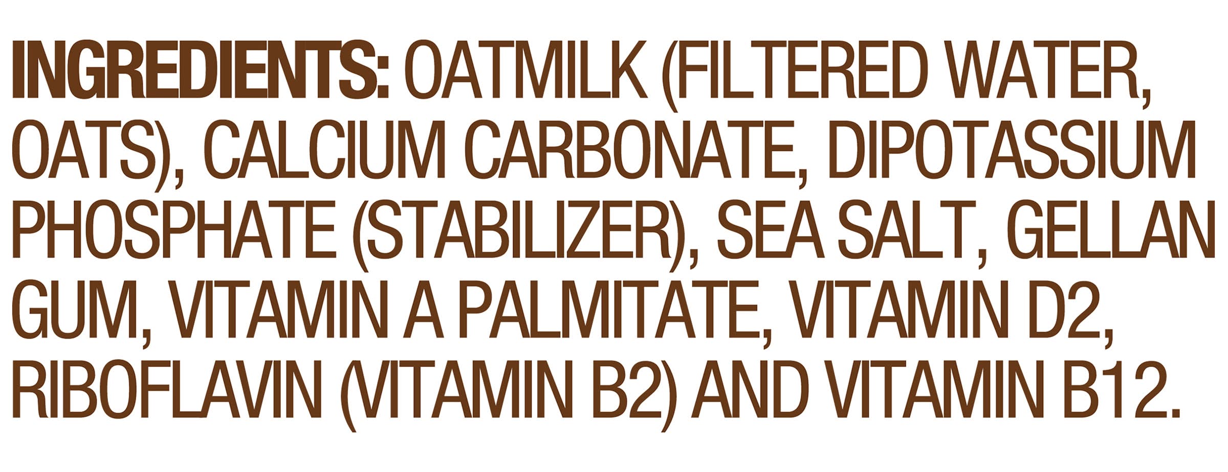Ingredients: OATMILK (FILTERED WATER, OATS), CALCIUM CARBONATE, DIPOTASSIUM PHOSPHATE (STABILIZER), SEA SALT, GELLAN GUM, VITAMIN A PALMITATE, VITAMIN D2, RIBOFLAVIN (VITAMIN B2) AND VITAMIN B12. Contains: NO ALLERGENS