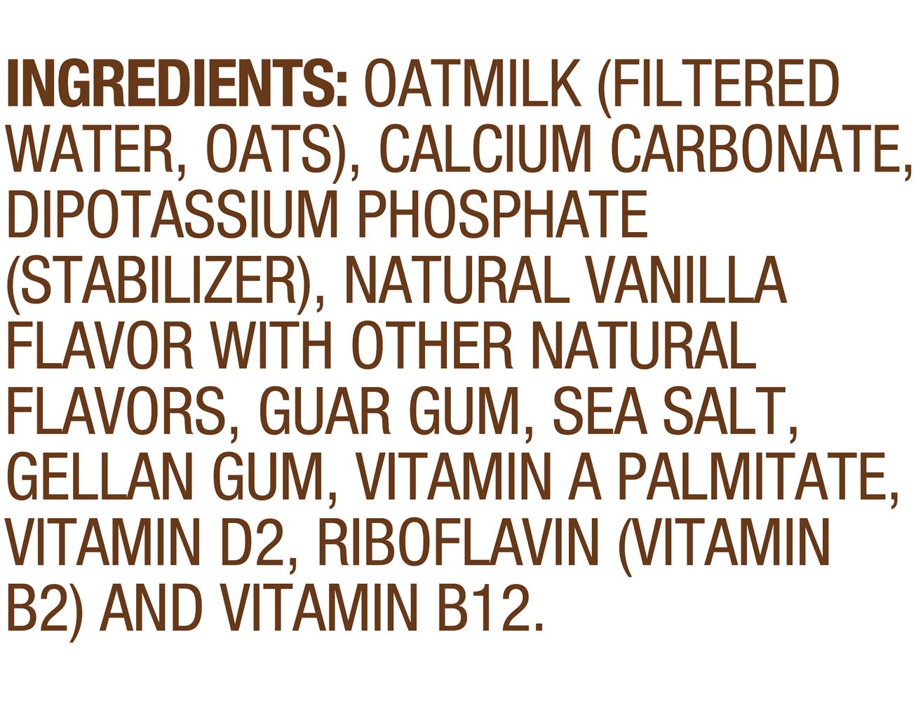 Ingredients: Oatmilk (Filtered Water, Oats), Calcium Carbonate, Dipotassium Phosphate (Stabilizer), Natural Vanilla Flavor with Other Natural Flavors, Guar Gum, Sea Salt, Gellan Gum, Vitamin A Palmitate, Vitamin D2, Riboflavin (Vitamin B2) and Vitamin B12. Contains: NO ALLERGENS