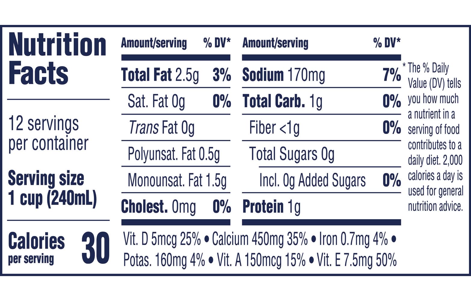 Ingredients: Almondmilk (Filtered Water, Almonds), Calcium Carbonate, Natural Flavors, Sea Salt, Potassium Citrate, Sunflower Lecithin, Gellan Gum, Vitamin A Palmitate, Vitamin D2, D-Alpha-Tocopherol (Natural Vitamin E). Contains: Almonds, Nuts / Tree Nuts