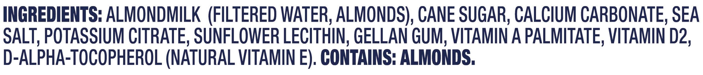 Ingredients: ALMONDMILK (FILTERED WATER, ALMONDS), CANE SUGAR, CALCIUM CARBONATE, SEA SALT, POTASSIUM CITRATE, SUNFLOWER LECITHIN, GELLAN GUM, VITAMIN A PALMITATE, VITAMIN D2, D-ALPHA-TOCOPHEROL (NATURAL VITAMIN E). Contains: Tree Nuts