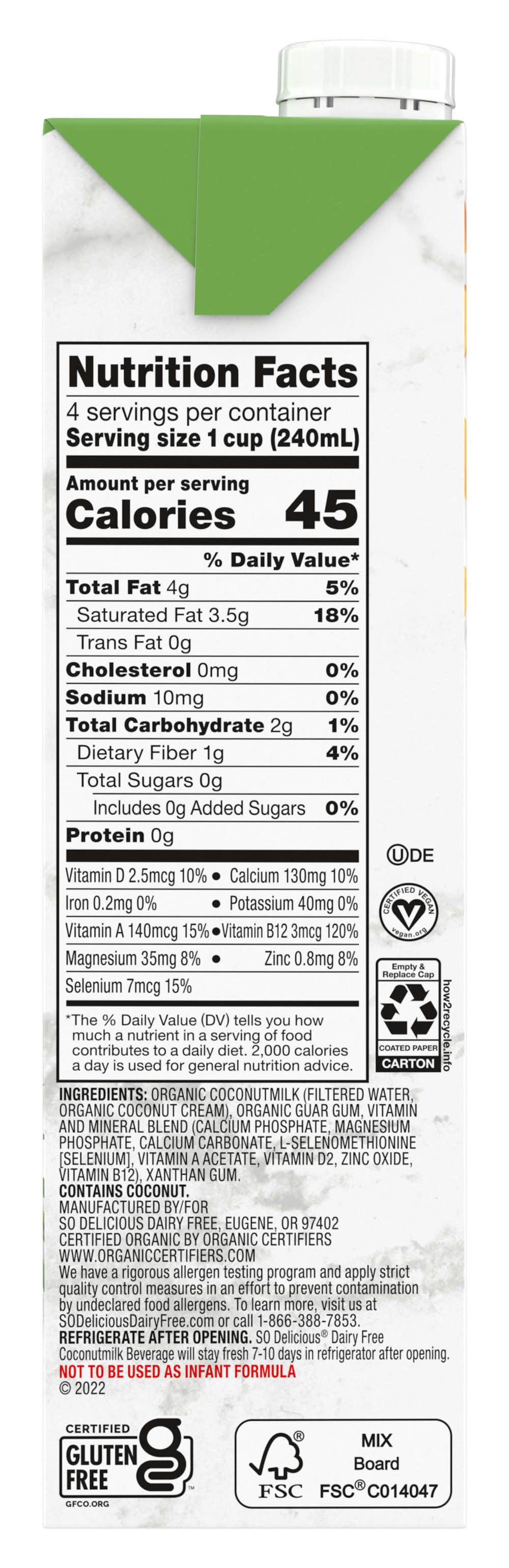 Ingredients: INGREDIENTS: Organic Coconutmilk (Filtered Water; Organic Coconut Cream), Organic Guar Gum, Vitamin and Mineral Blend (Calcium Phosphate; Magnesium Phosphate; Calcium Carbonate; L-Selenomethionine [Selenium]; Vitamin A Acetate; Vitamin D2; Zinc Oxide; Vitamin B12), Xanthan Gum Contains: Contains coconut. Produced in a facility that also processes other tree nuts and soy. We have a rigorous allergen testing program and apply strict quality control measures in an effort to prevent contamination by undeclared food allergens.