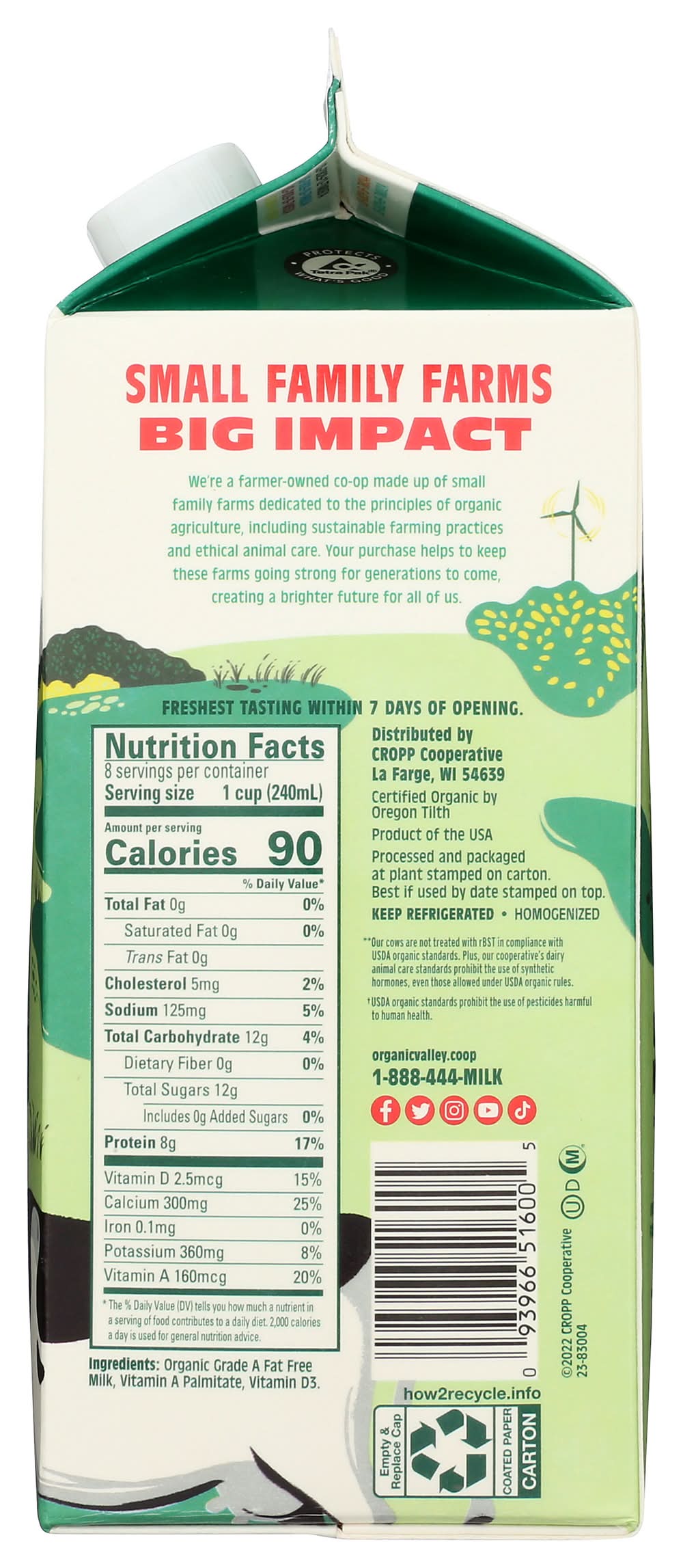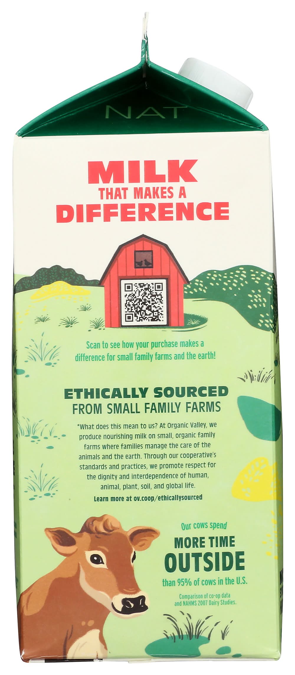 Fat free. USDA Organic. Certified Organic by Oregon Tilth. Halal. 0% milk fat. Vitamin A & D. 12 essential nutrients. Organic is always non GMO. Pasture-raised. Ultra pasteurized. No synthetic hormones (Our cows are not treated with RBST in compliance with USDA organic standards. Plus, our cooperative's dairy animal care standards prohibit the use of any added hormones, even those allowed under USDA organic rules). Farmer-owned. Grazing the way to high-quality milk. Our founding farmers believed giving cows more time outside to roam on organic pastures was better for the milk, the earth, and the animals. We still believe this today and continue to look for new sustainable ways to bring you and your family pure, great-tasting milk. 57 quality checks. Our Organic Ideals Never Expire: Organic Valley helped write the first USDA organic livestock standards in 2001-and we remain just as committed to organic agriculture today. Our farms are certified organic and follow our cooperative's standards. This means: No antibiotics; No synthetic hormones (Our cows are not treated with rBST in compliance with USDA organic standards. Plus, our cooperative's dairy animal care standards prohibit the use of any added hormones, even those allowed under USDA organic rules); No toxic pesticides (USDA organic standards prohibit the use of pesticides harmful to human health); No GMOs are used on our farms. Milk that makes a difference. Our cows spend more time outside than 95% of cows in the U.S. Comparison of co-op data and NAHMS 2007 Dairy Studies. Processed and packaged at plant stamped on carton. Homogenized. Grade A. Scan to see how your purchase makes a difference for small family farms and the earth! Small family farms. Big impact. We’re a farmer-owned co-op made up of small family farms dedicated to the principles of organic agriculture, including sustainable farming practices and ethical animal care. Your purchase helps to keep these farms going strong for generations to come, creating a brighter future for all of us. Tetra Pak: Protects what's good. Ethically sourced from small family farms At Organic Valley, we produce nourishing milk on small, organic family farms where families manage the care of the animals and the earth. Through our cooperative's standards and practices, we promote respect for the dignity and interdependence of human, animal, plant, soil, and global life. Packaging: Reusable