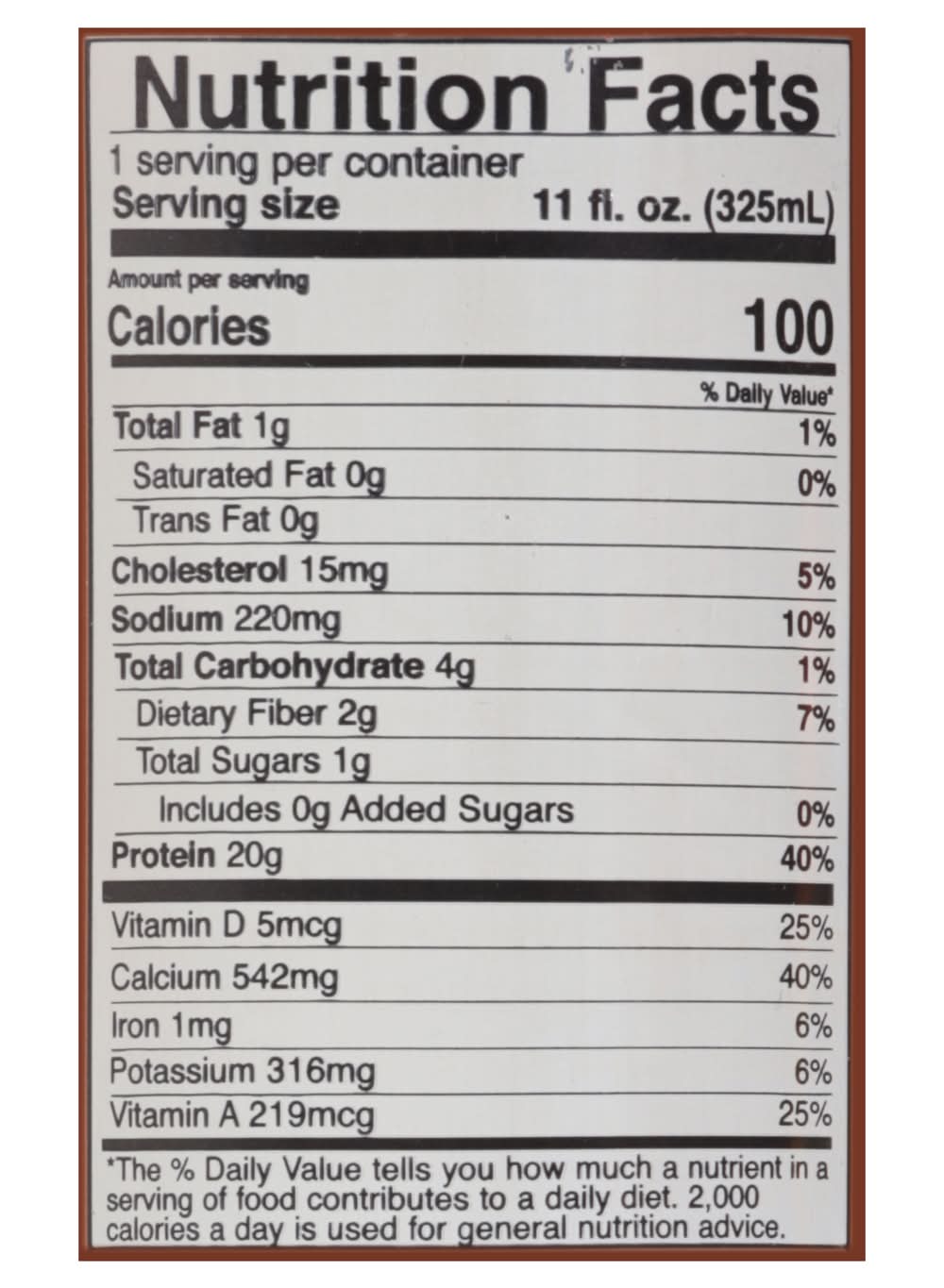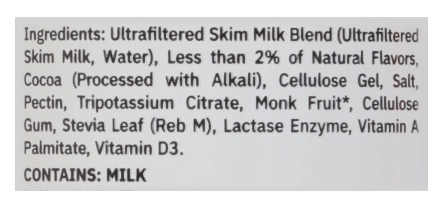 Ingredients: Ultrafiltered Skim Milk Blend (Ultrafiltered Skim Milk, Water), Less than 2% of Natural Flavors, Cocoa (Processed with Alkali), Cellulose Gel, Salt, Pectin, Tripotassium Citrate, Monk Fruit*, Cellulose Gum, Stevia Leaf (Reb M), Lactase Enzyme, Vitamin A Palmitate, Vitamin D3. *Adds an Insignificant Amount of Sugar Contains: Milk