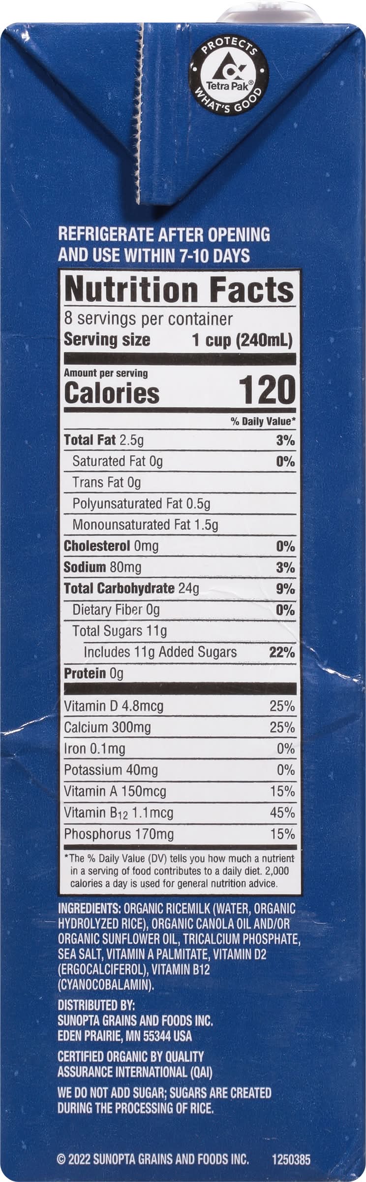 This Rice Drink provides a refreshing alternative to dairy beverages. It is enriched with calcium and vitamin D, and also contains vitamins A and B12. This rice drink is certified organic by Quality Assurance International, as well as being certified gluten-free. It is free from lactose, dairy, soy, and cholesterol, offering a low-fat option for those seeking non-dairy drinks. It is also verified by the Non-GMO Project. This product's shelf-stable packaging allows for convenient storage in the pantry for up to one year unopened, without the need for preservatives or refrigeration. It is designed to be enjoyed on its own, with cereal, in smoothies, or in a variety of recipes. • Hain Celestial Group, Lake Success, NY 11042 • Packaging: Reusable