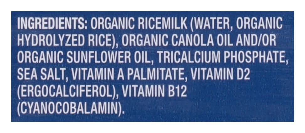 Ingredients: Ricemilk (Water, Hydrolyzed Rice), Canola Oil and/or Sunflower Oil, Tricalcium Phosphate, Natural Flavor, Sea Salt, Vitamin A Palmitate, Vitamin D2 (Ergocalciferol), Vitamin B12 (Cyanocobalamin)