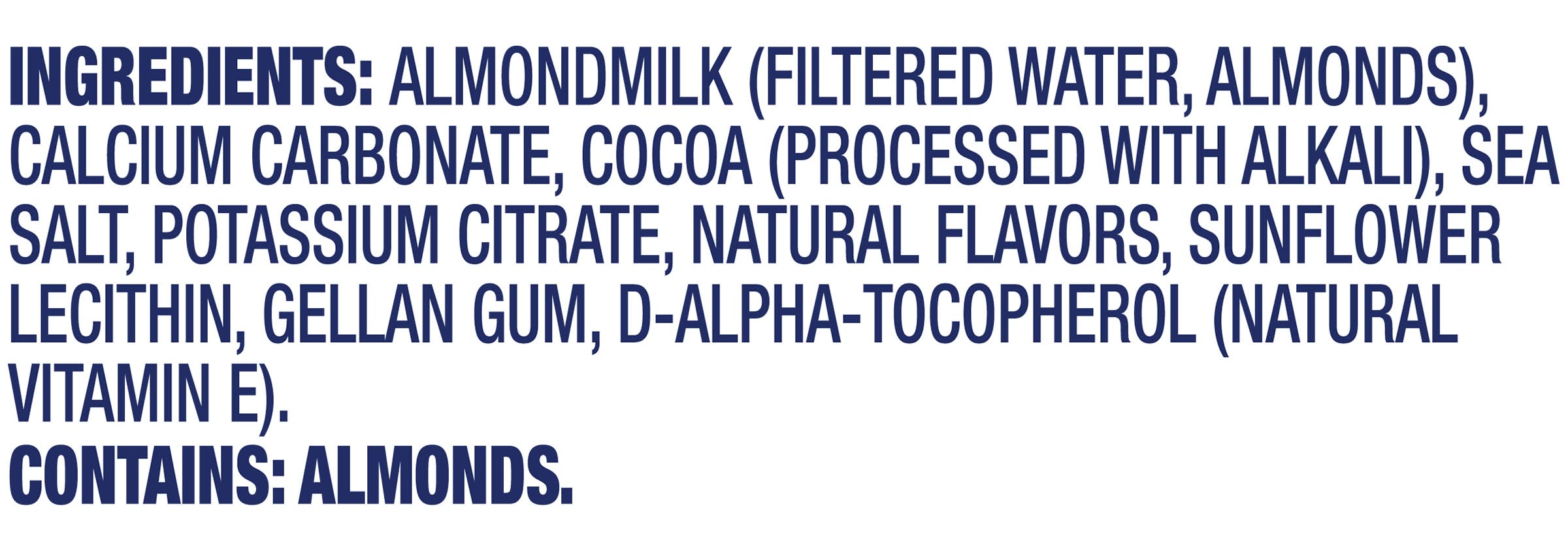 Ingredients: ALMONDMILK (FILTERED WATER, ALMONDS), CALCIUM CARBONATE, COCOA (PROCESSED WITH ALKALI), SEA SALT, POTASSIUM CITRATE, NATURAL FLAVORS, SUNFLOWER LECITHIN, GELLAN GUM, D-ALPHA-TOCOPHEROL (NATURAL VITAMIN E). Contains: Contains: almonds.
