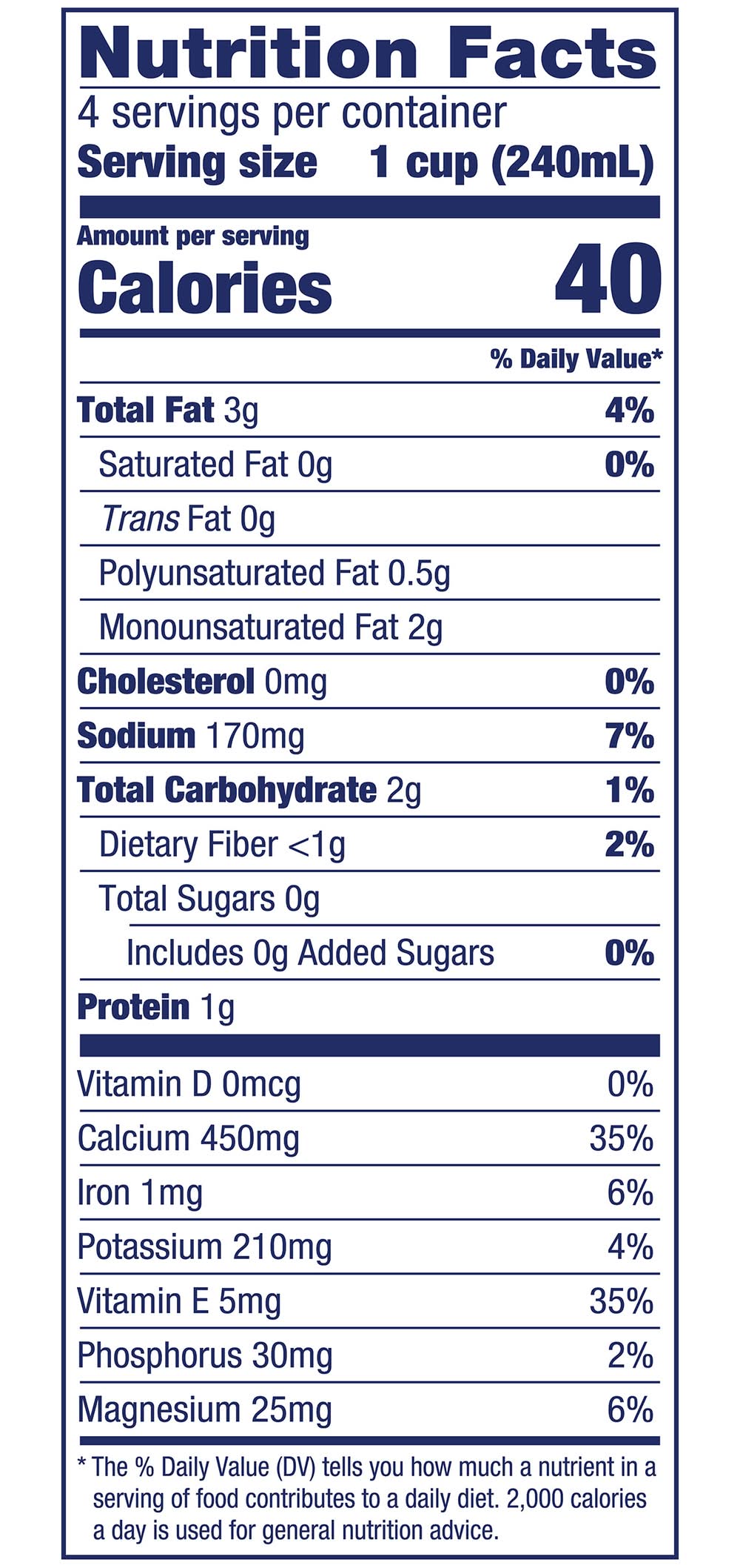 Almond Milk • Flavor: Unsweetened chocolate • Blue diamond growers, Sacramento,CA,95812 • Packaging: Reusable